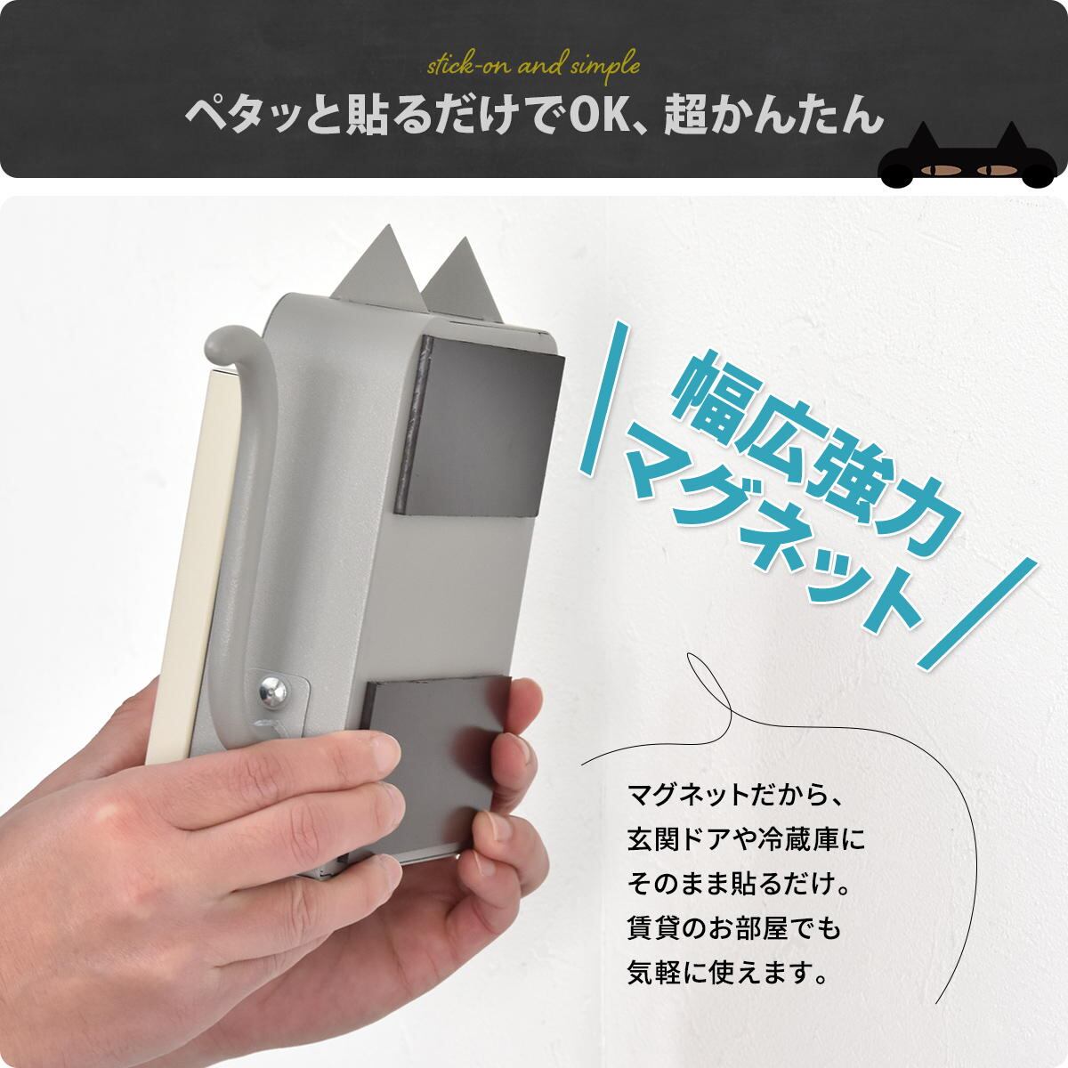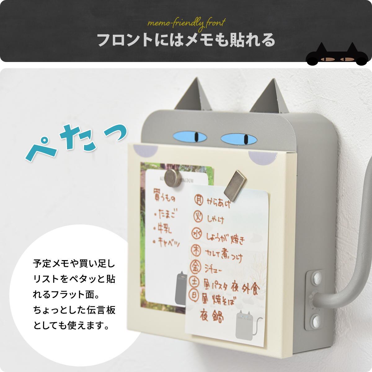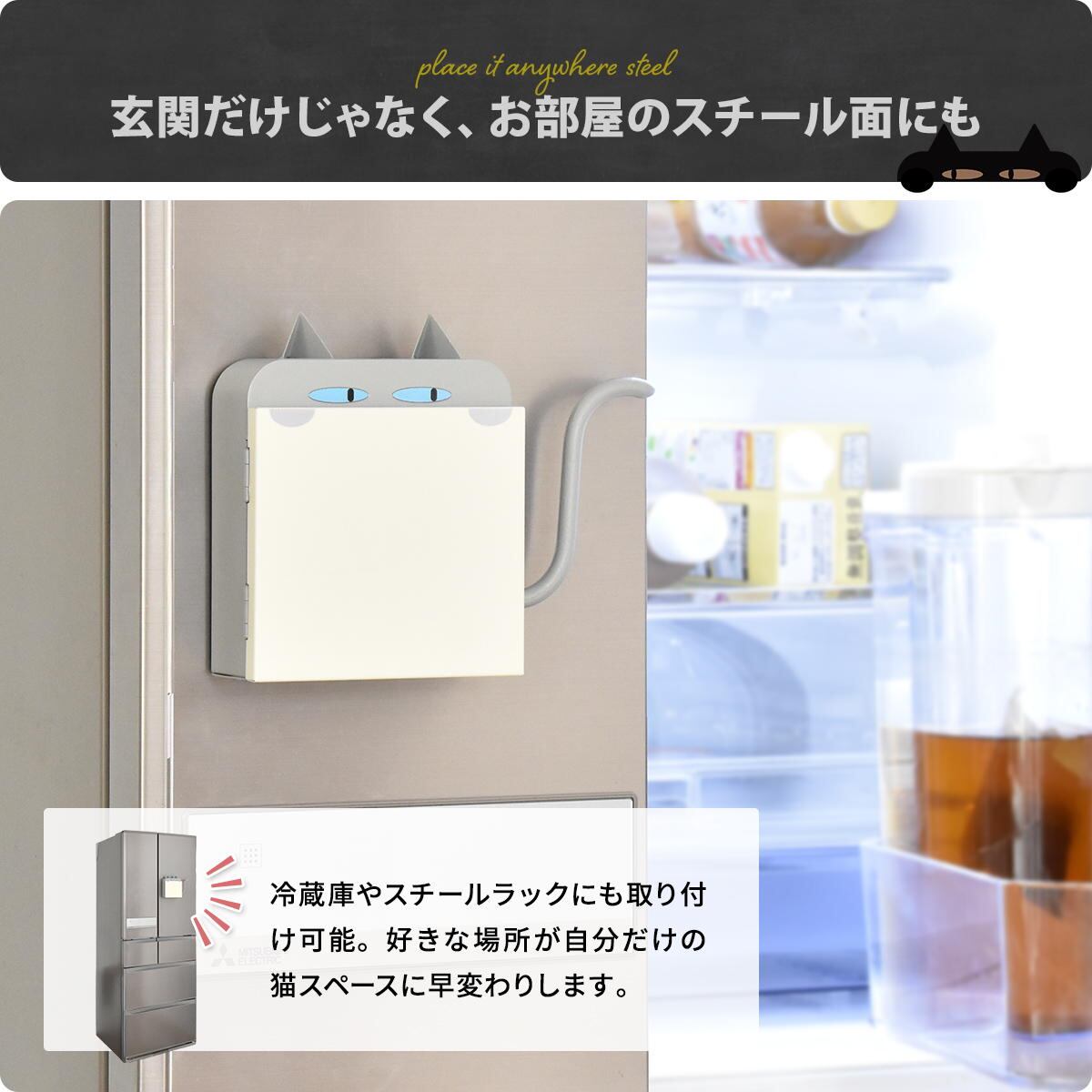 マグネットで取り付けできるので、玄関ドアや冷蔵庫にそのまま貼るだけで気軽に使える23cm幅の猫型キーボックスです。