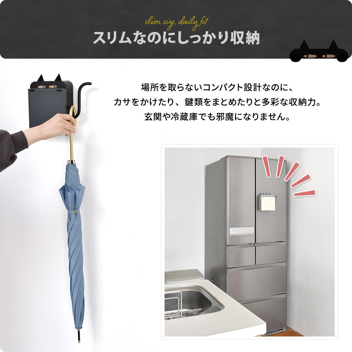 場所を取らないコンパクトでスリムな設計ながら、鍵類をまとめたり、傘を掛けたりなど、多彩な収納力を備えており、玄関や冷蔵庫での使用にも邪魔になりません。
