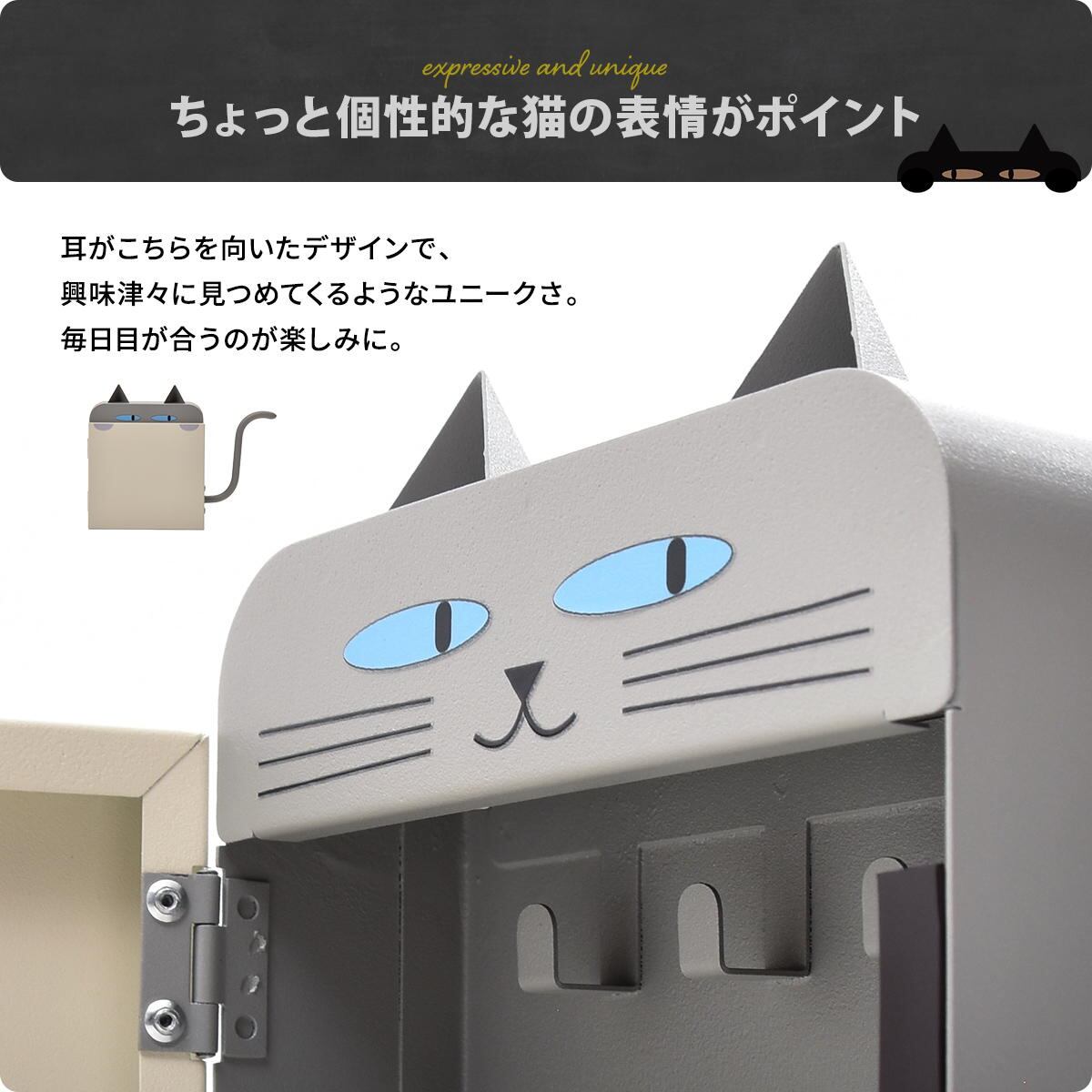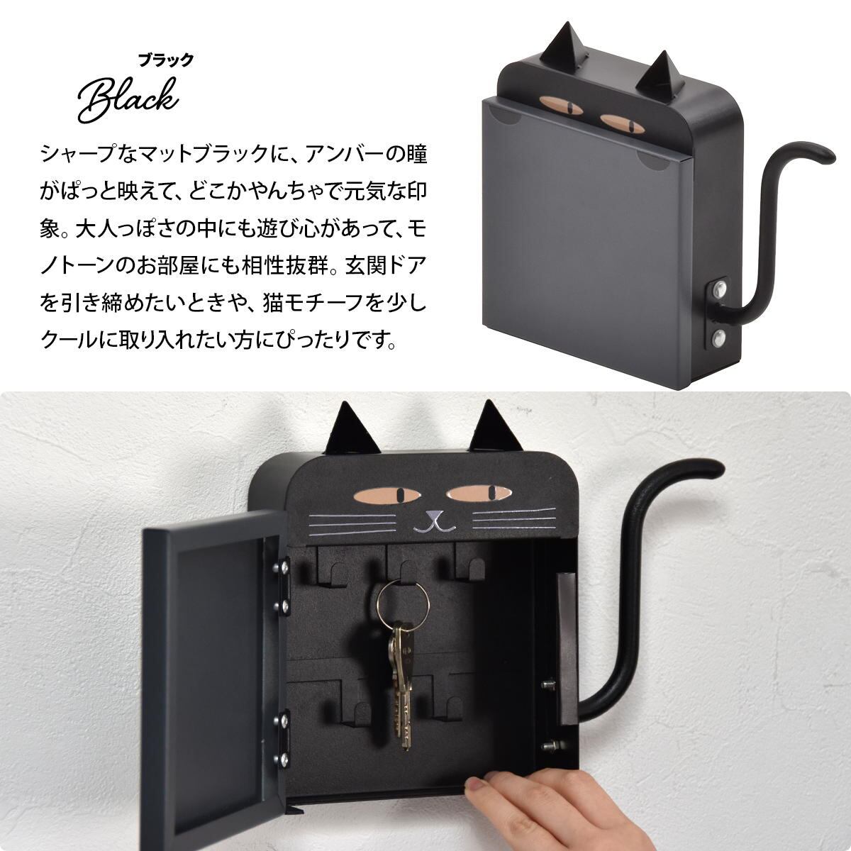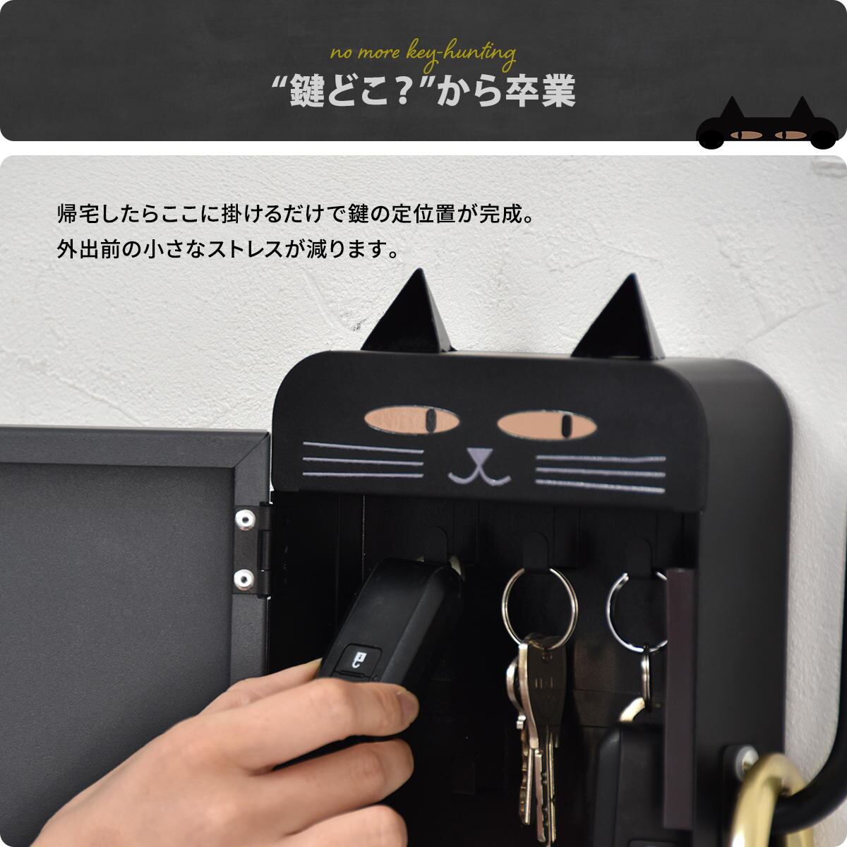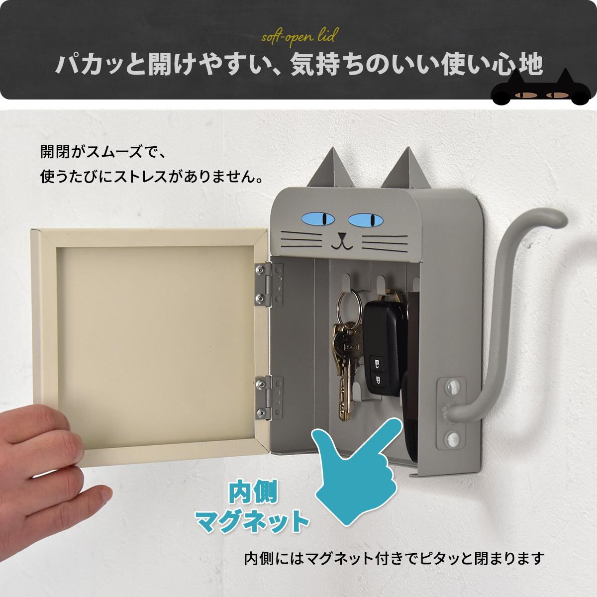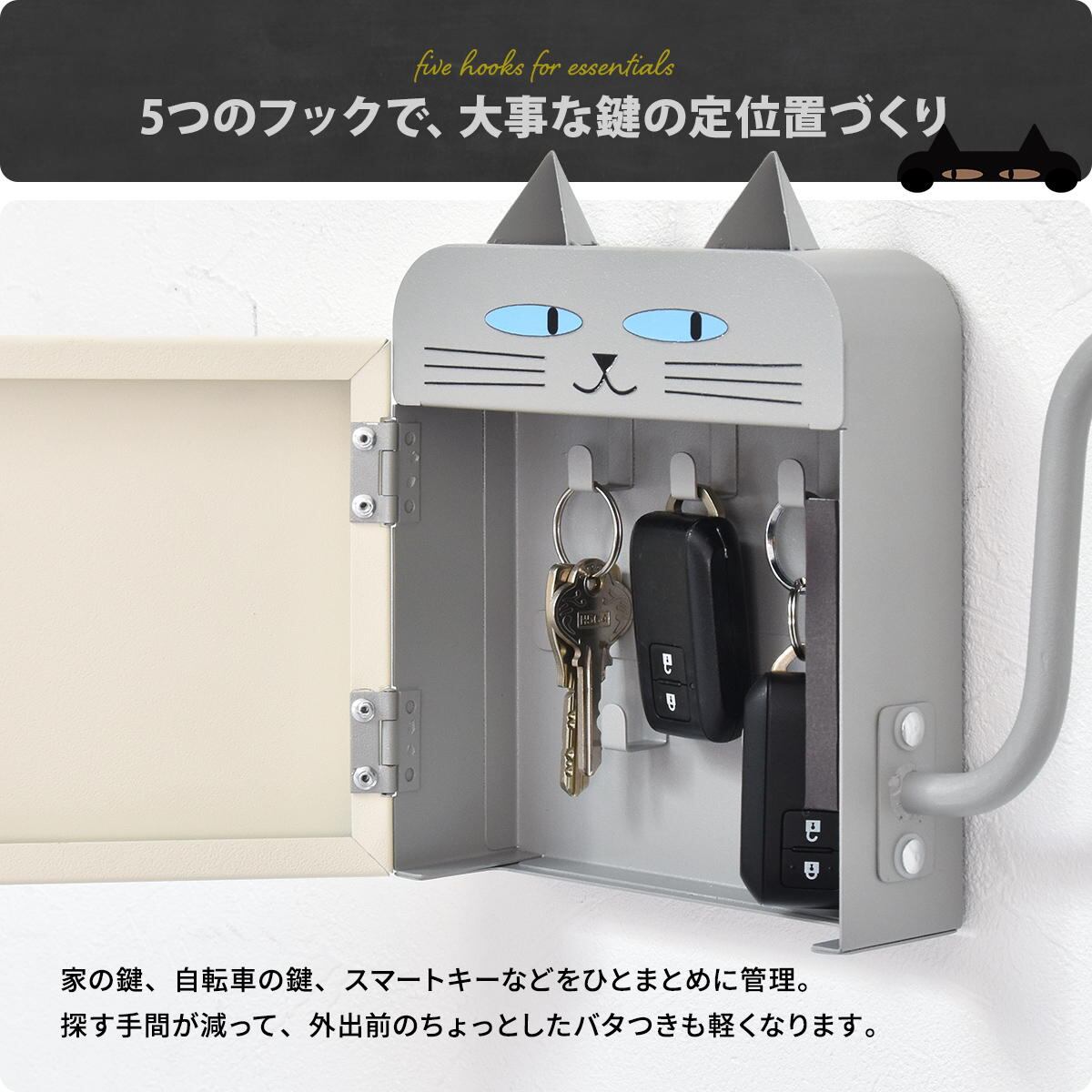 猫型キーボックス 23cm幅 ブラック ライトグレー 鍵収納 キー収納 玄関収納 マグネット設置 引っ掛け収納 スチール製 おすすめ おしゃれ モダン スタイリッシュ 猫モチーフ キャットキーボックス かわいい 玄関収納ボックス キッチン収納 冷蔵庫取り付け 傘引っ掛け収納 鍵ボックス