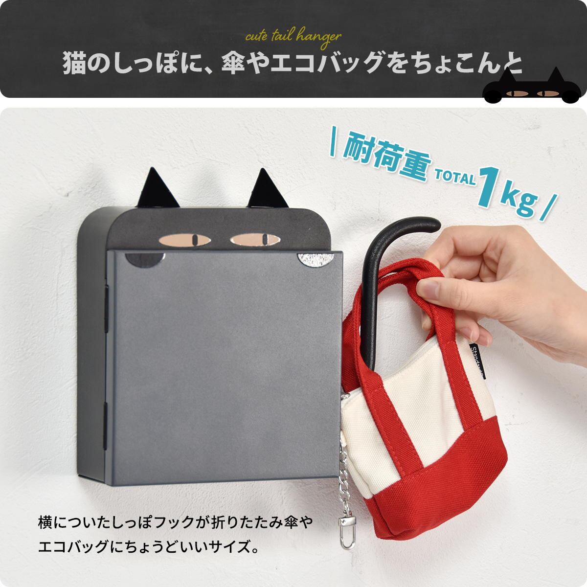 サイドに付いたしっぽフックが折りたたみ傘やエコバッグを引っ掛けておくのにちょうど良いサイズ感です。