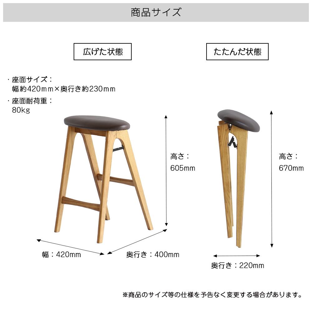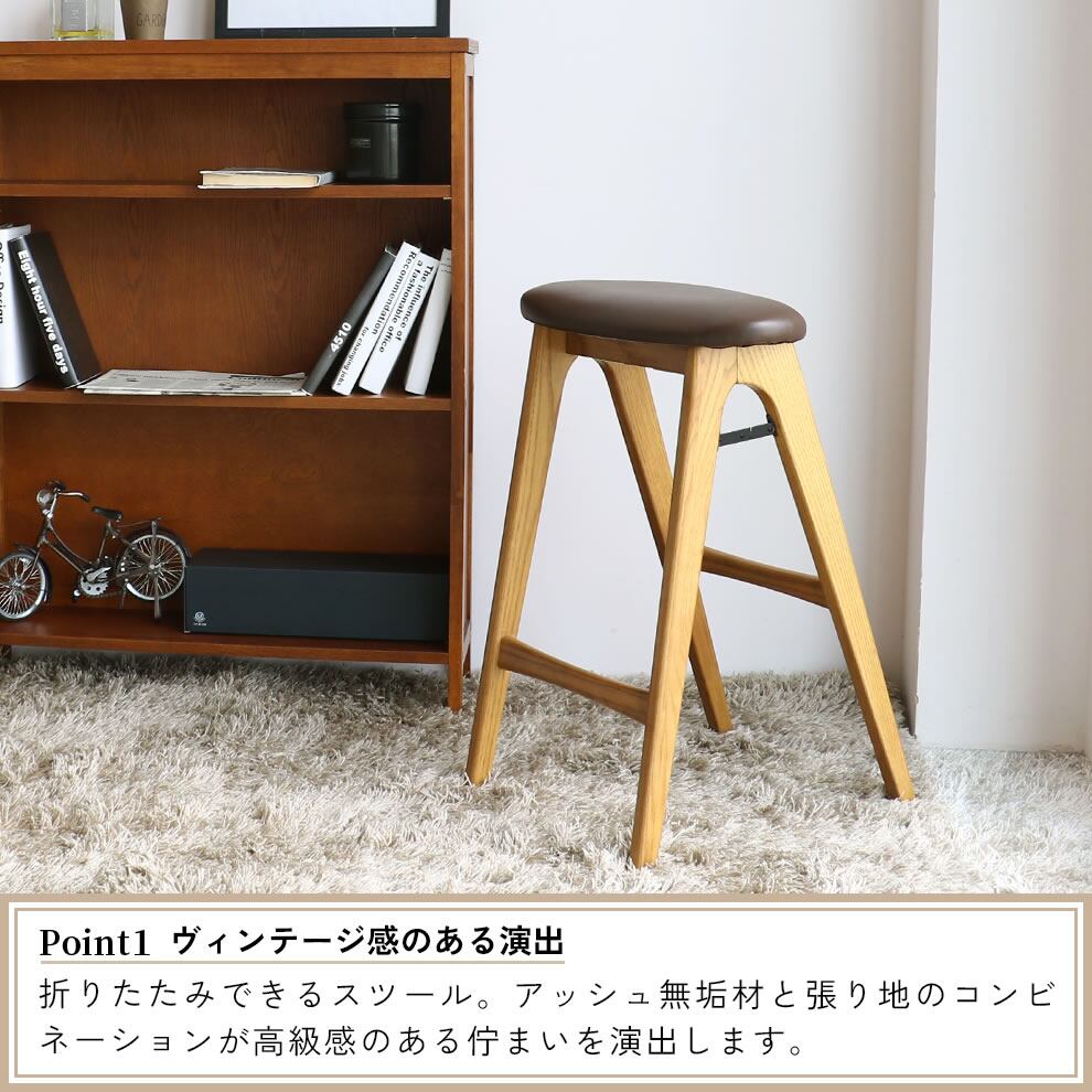 アッシュ無垢材の美しい木目が特徴の折り畳み式のハイスツール1脚単品です。