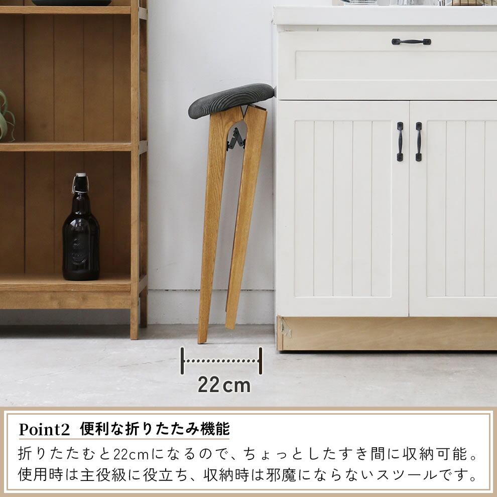 折りたたみ式で、畳むと奥行(約)22cmと非常にコンパクトに収納可能で、キッチンやリビングのちょっとしたに収納できるハイスツールです。