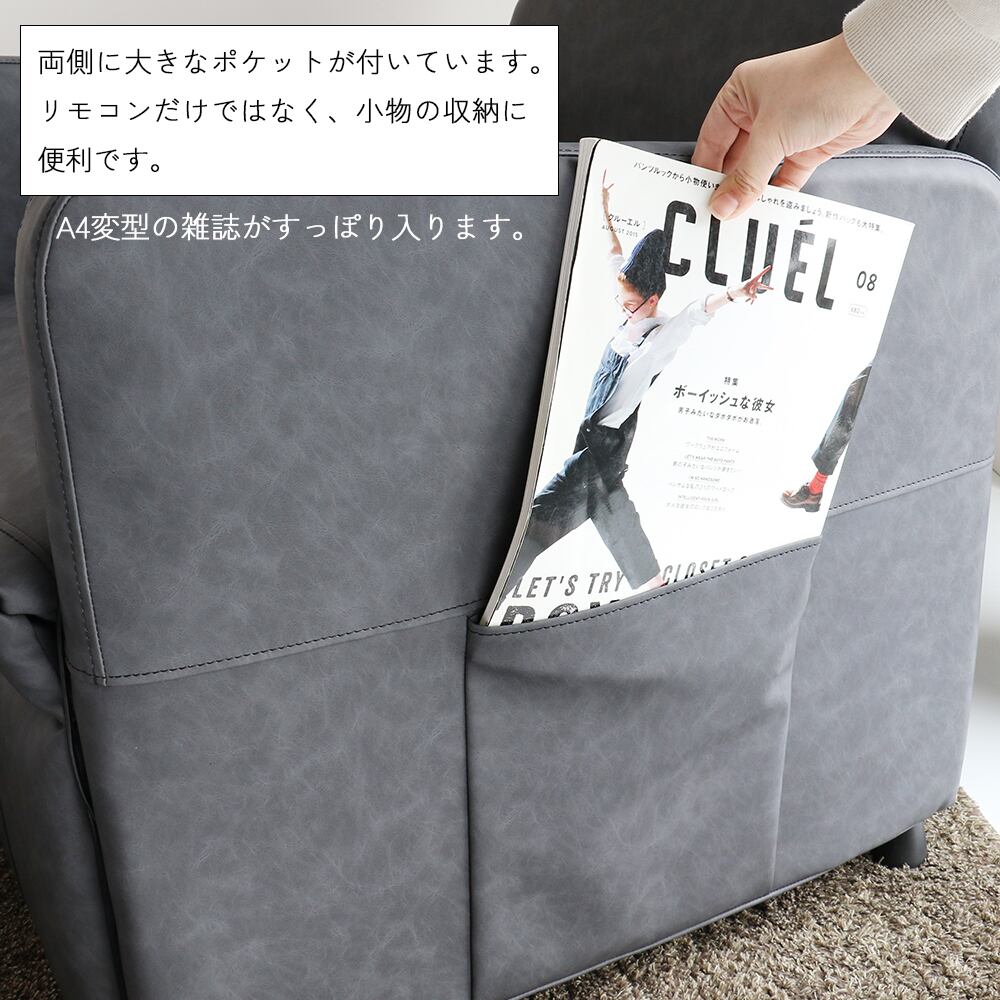 ソファ両側には大きなポケットを備えており、リモコンの収納はもちろん、小物や雑誌の収納にもおすすめです。