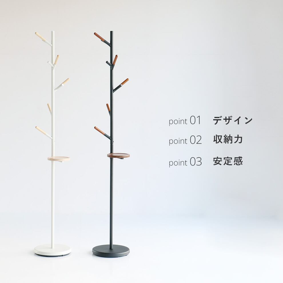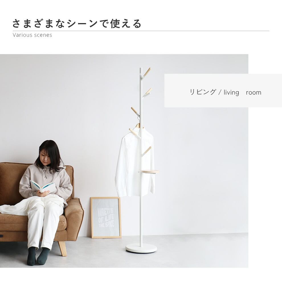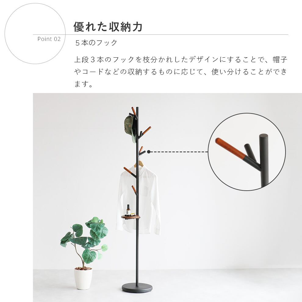 上段3本のフックを枝分かれしたデザインにすることで、帽子やコートなどの収納するものに応じて、使い分けが可能です。