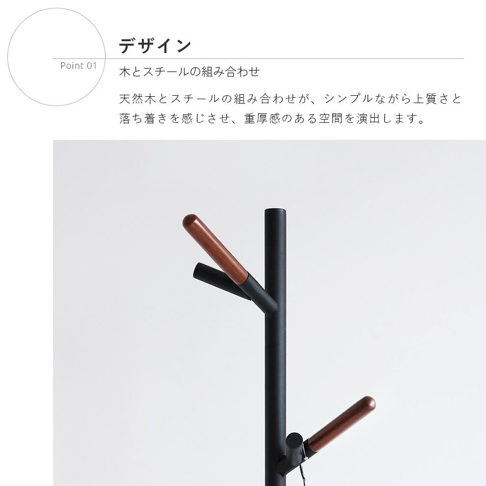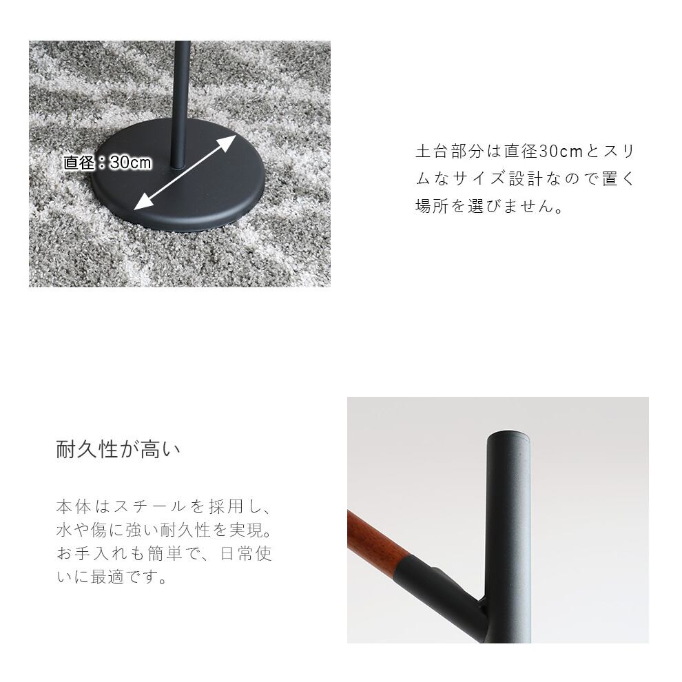 天然木とスチールの組み合わせが、シンプルながら上質さと落ち着きを感じさせる34.5cm幅のポールハンガーです。