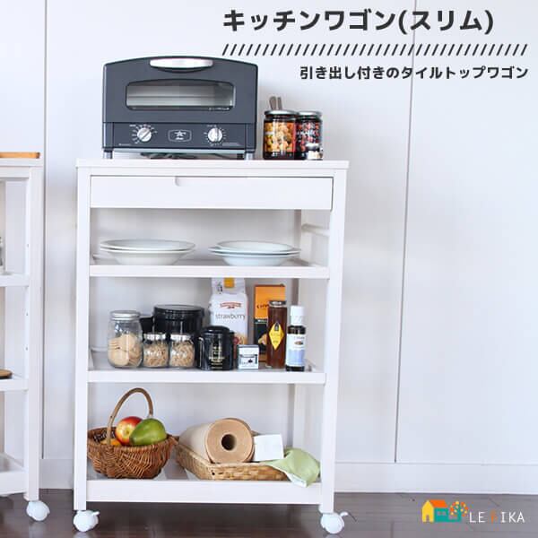 キッチンワゴン ホワイト 白 キッチン収納 引き出し付きワゴン キャスター付き収納 コンパクト 幅60cm 奥行39cm 高さ85cm キャスター付き キッチン収納 キッチン用品収納 リビング収納 収納ワゴン ワゴン おすすめ 北欧 タイルトップワゴン 棚板高さ調節可能 送料無料