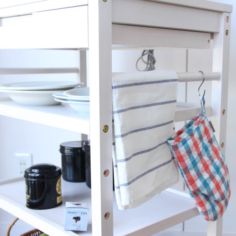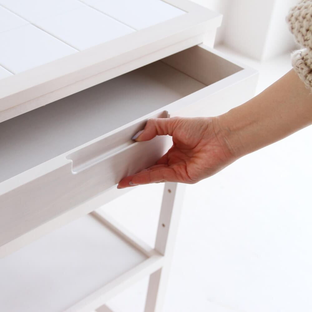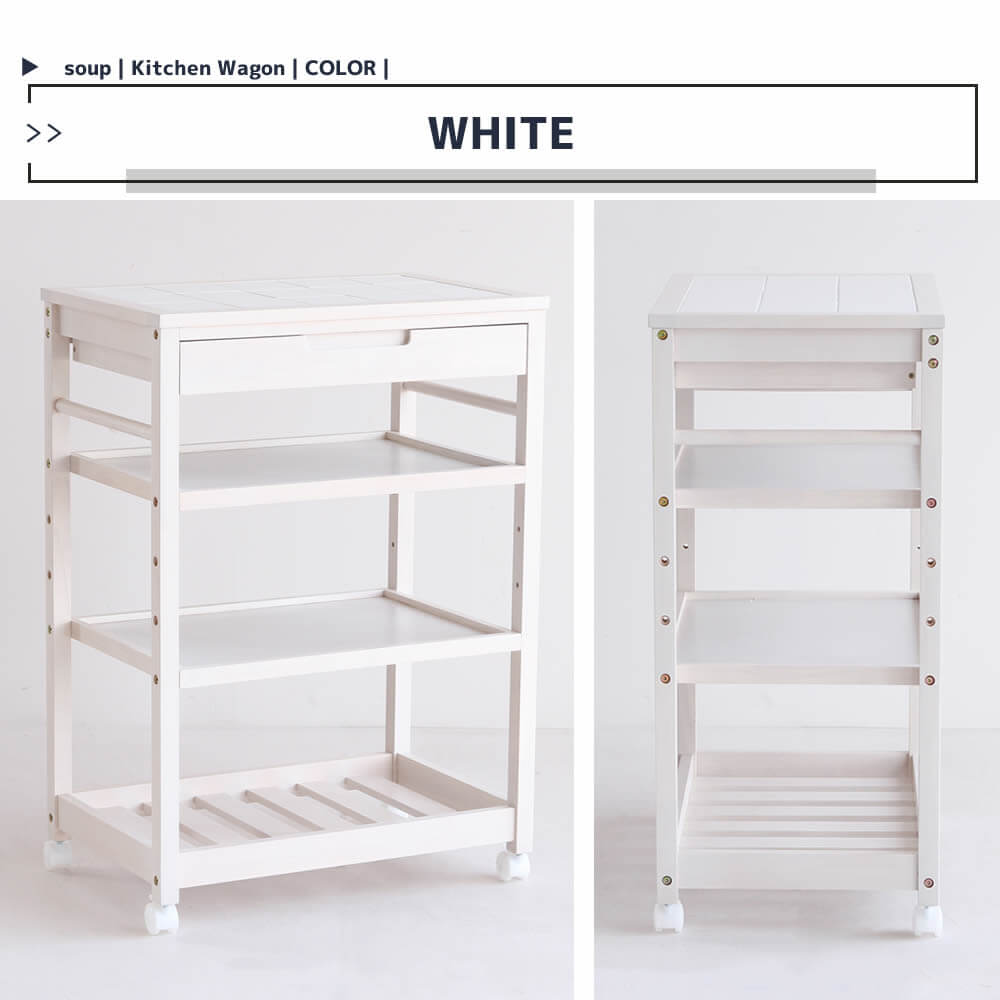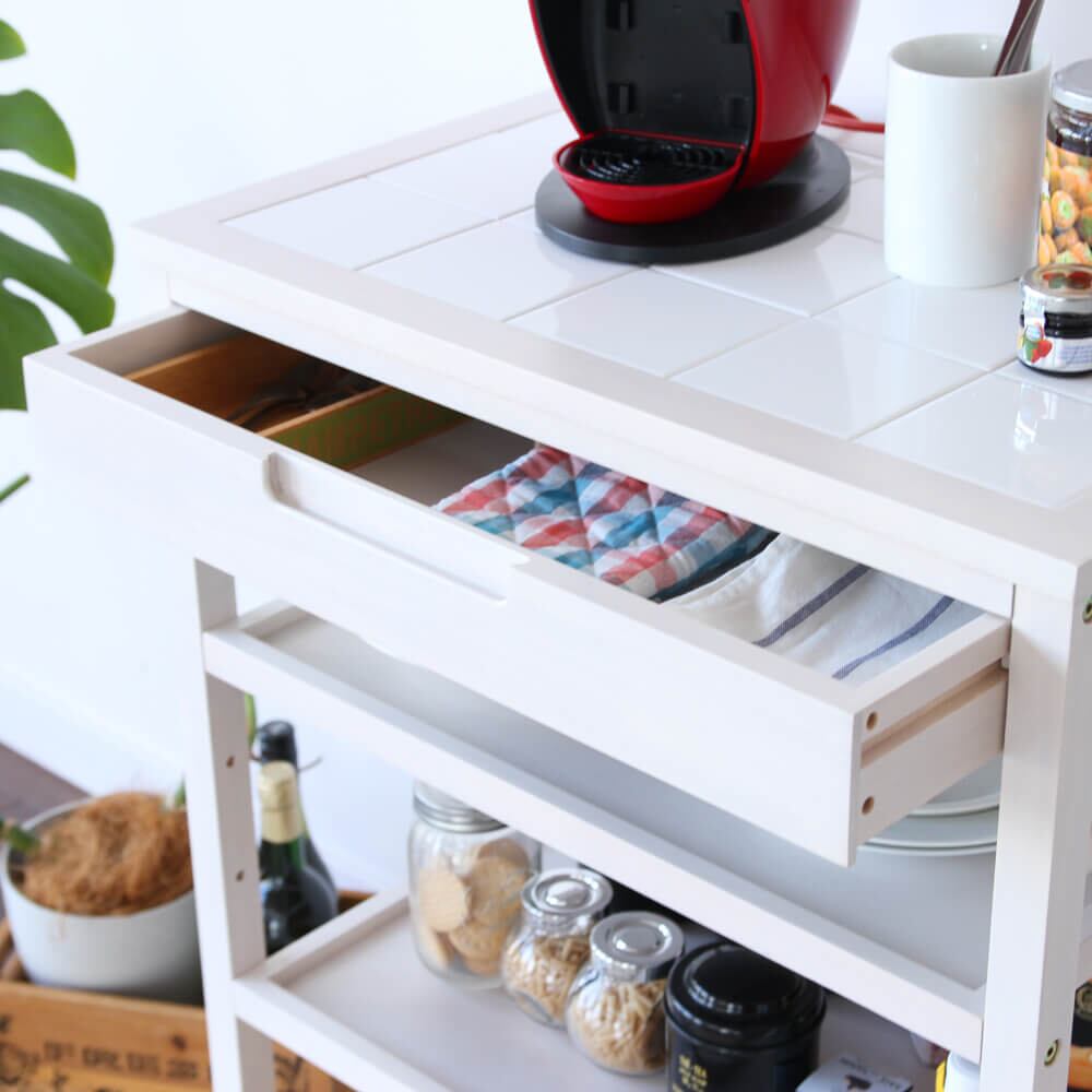 熱いお鍋などが置けるタイルトップ、キッチン用品がたっぷり収納できる引き出し、高さ調節可能な棚板、収納力と機能性を兼ね備えたキッチンワゴンです。