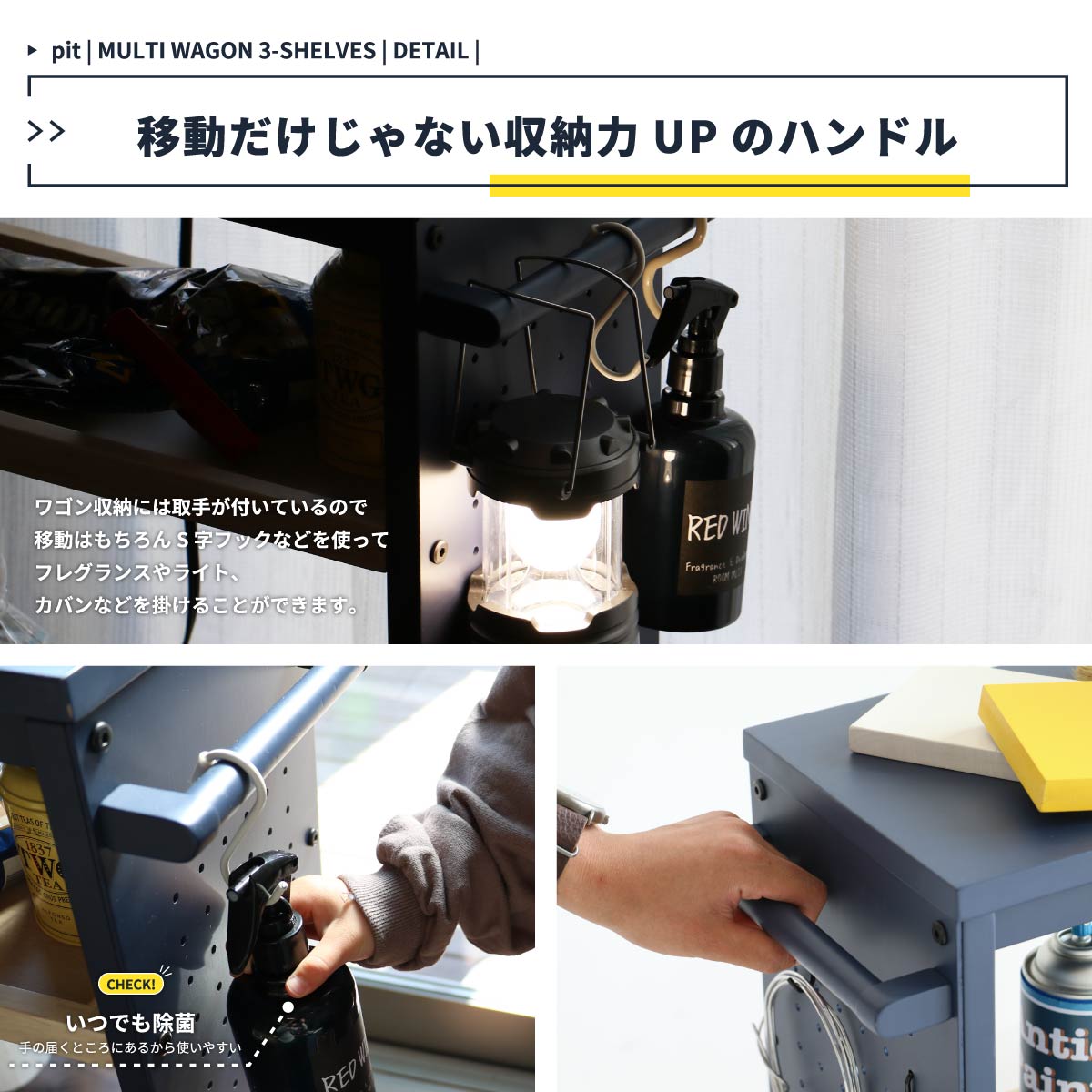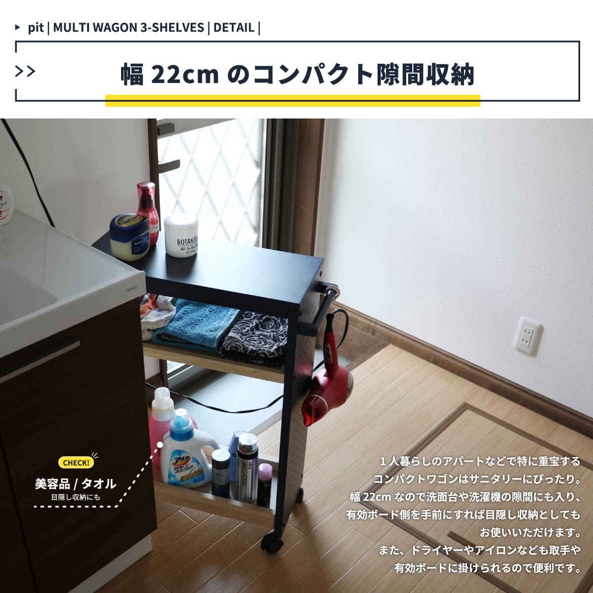キッチンやランドリー、DIYのような作業等、マルチに活躍する収納をカスタマイズできる有孔ボード付きマルチワゴンです。