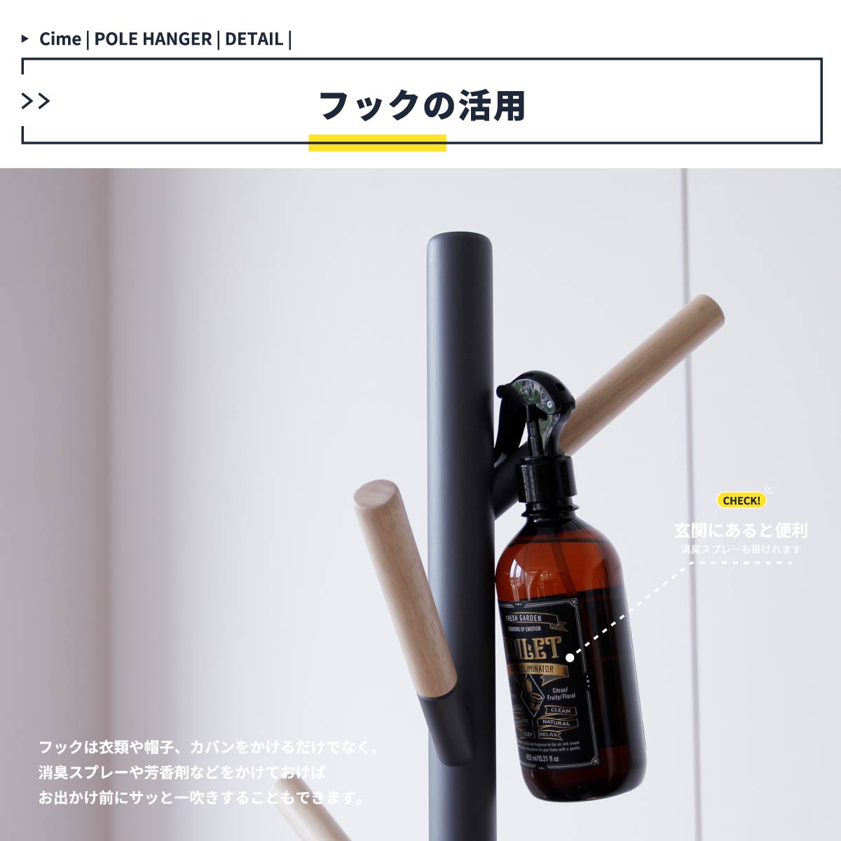 フックが6個付いているので、大人も子供も使用可能な高さの6連ポールハンガーです。