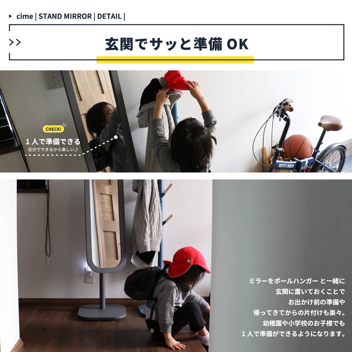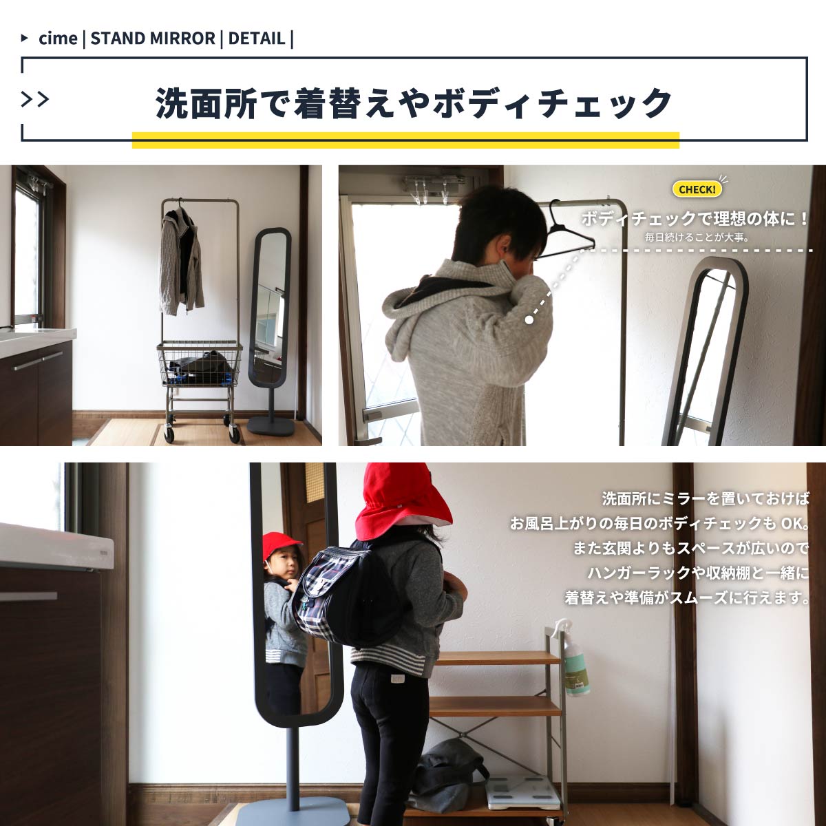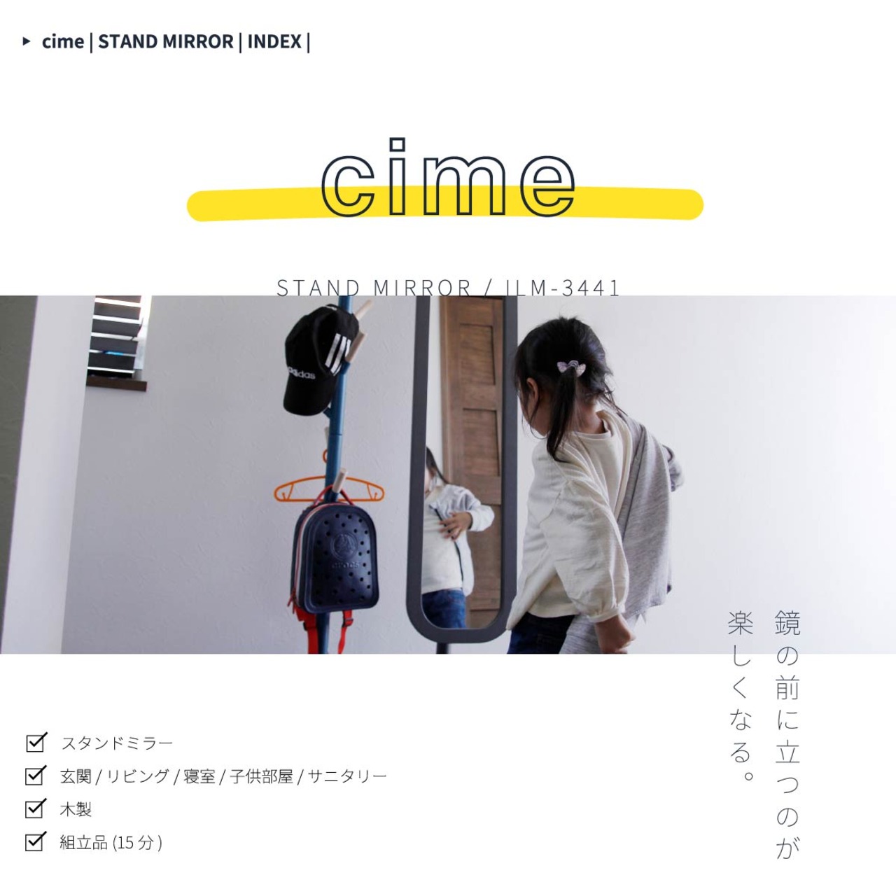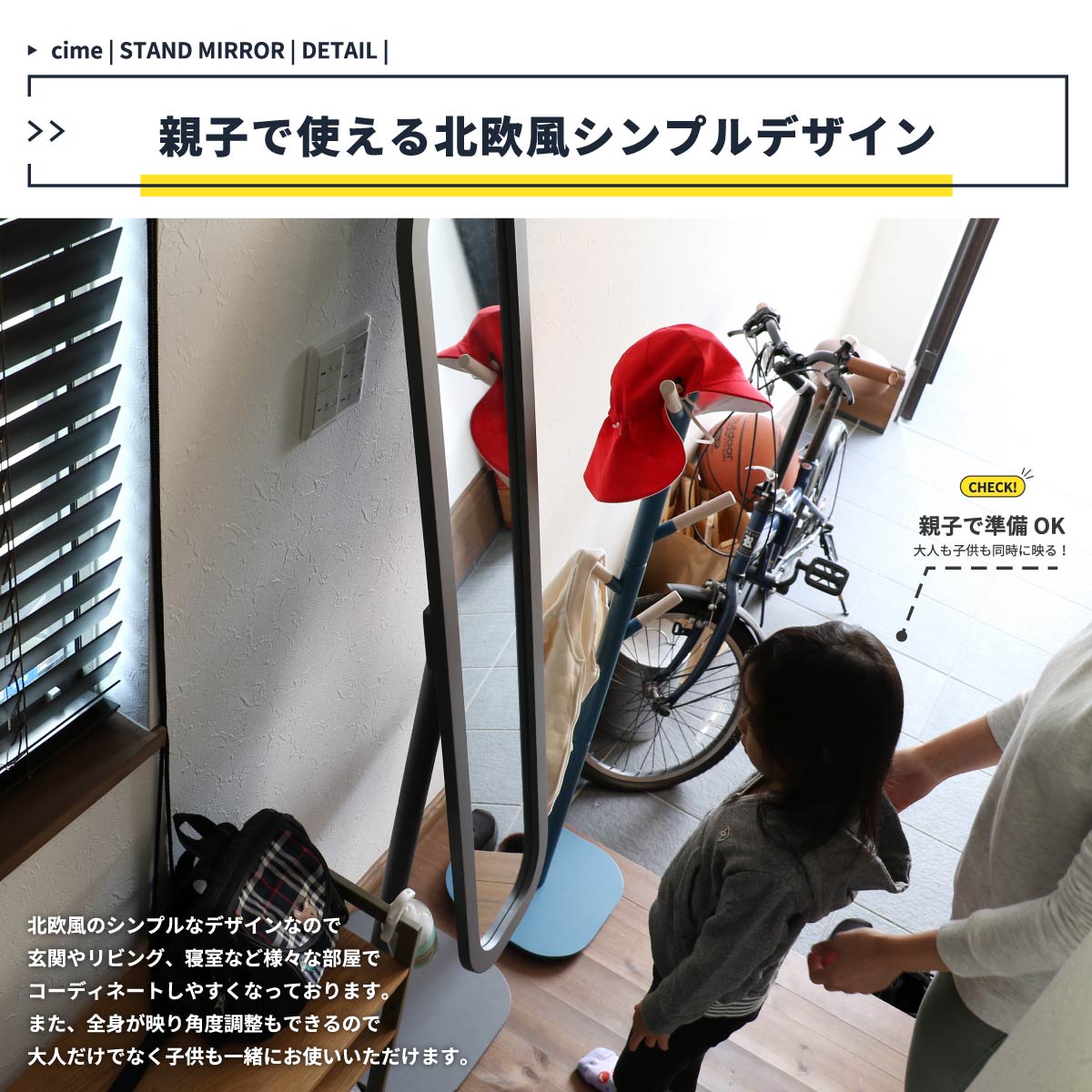 全体的に丸みを持たせたデザインとなっており、柔らかい印象を与える、姿見として活躍してくれるスタンドミラーです。
