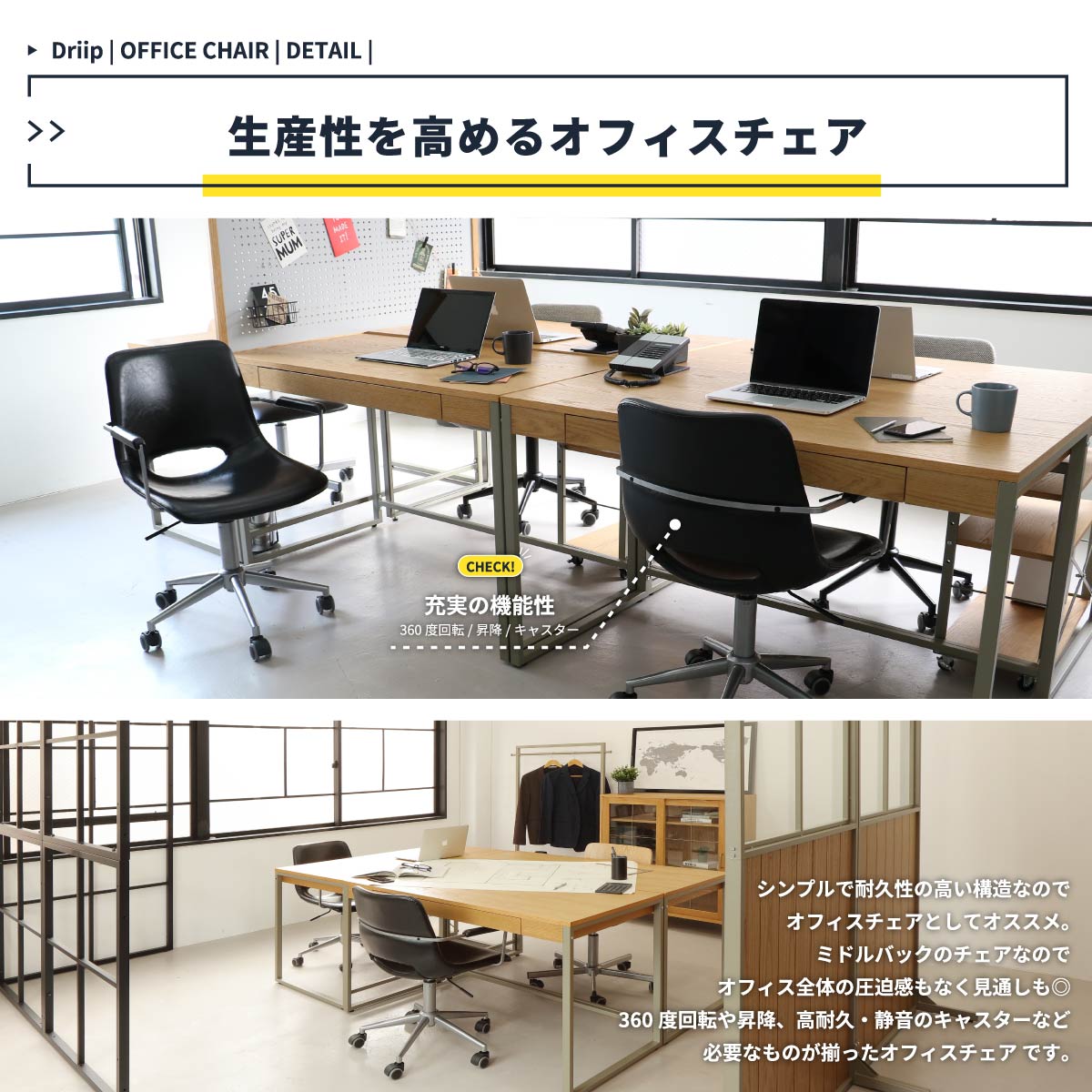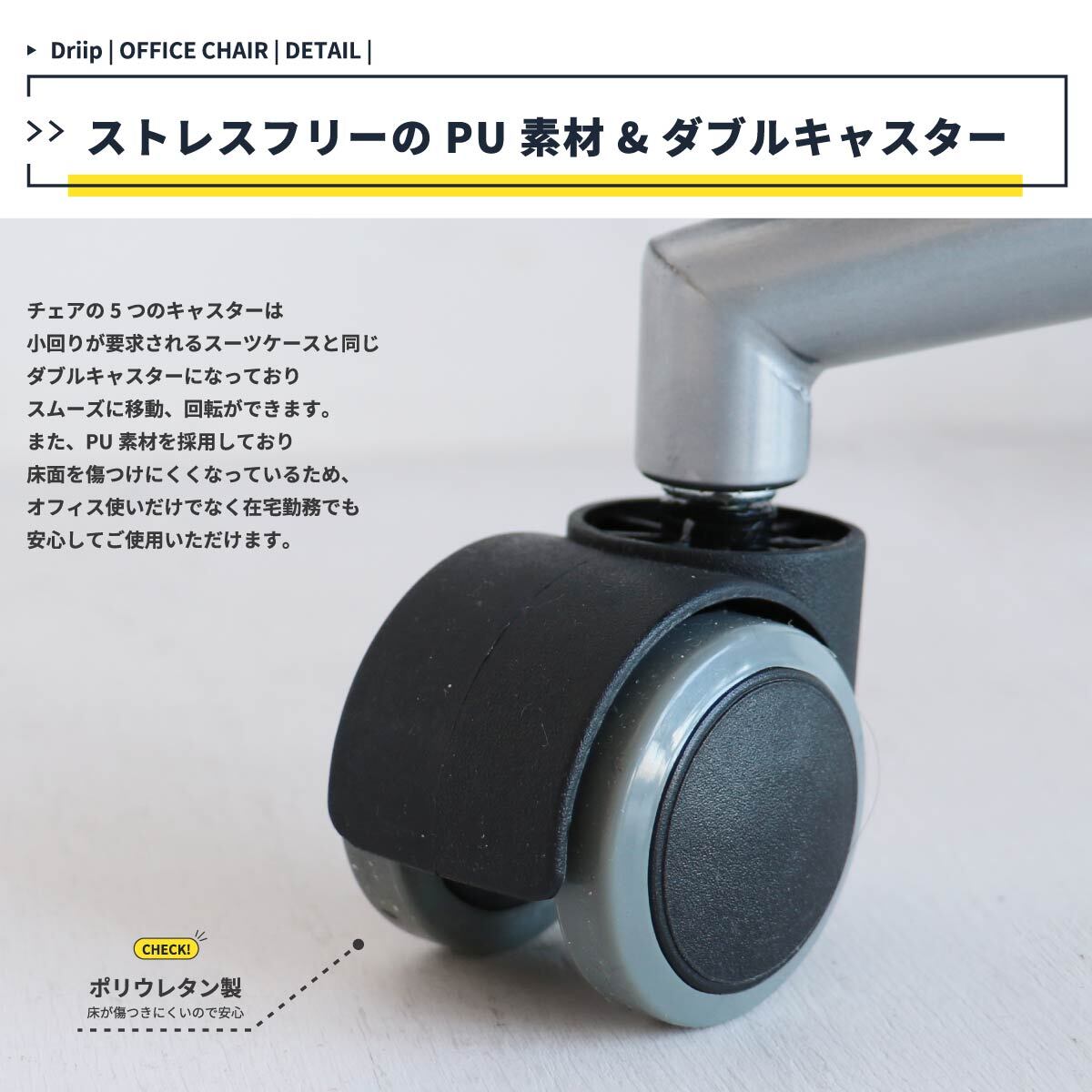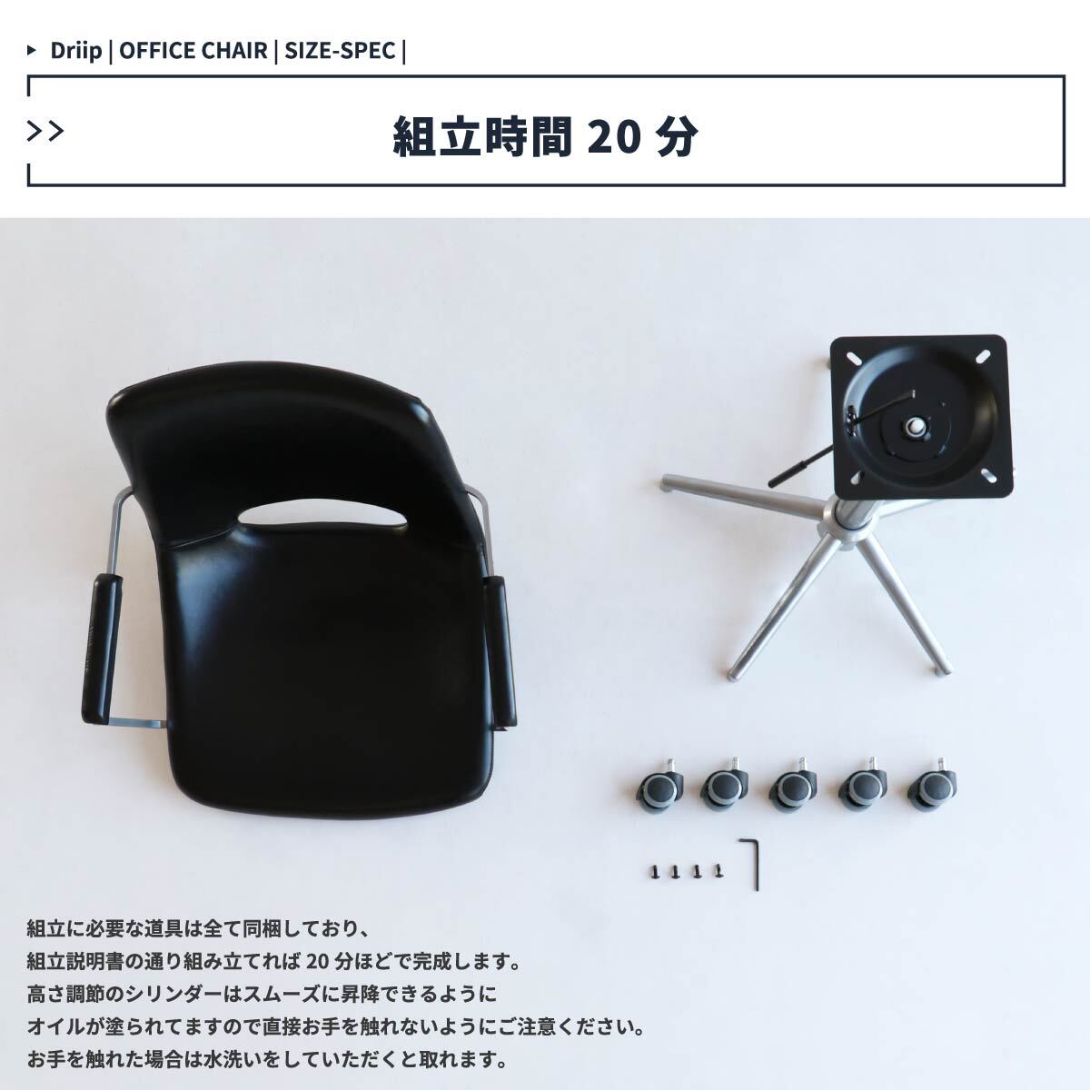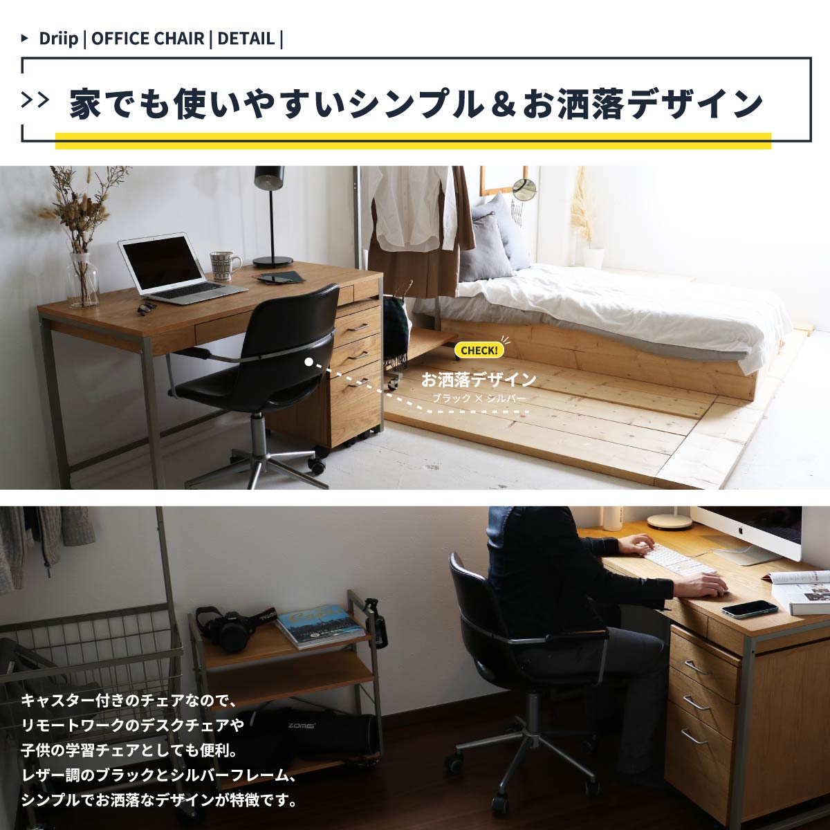 コンパクトなサイズ感のデスクチェアーで空間を圧迫せず、無段階昇降式なので色んなデスクの高さに対応可能なキャスター付きオフィスチェアです。