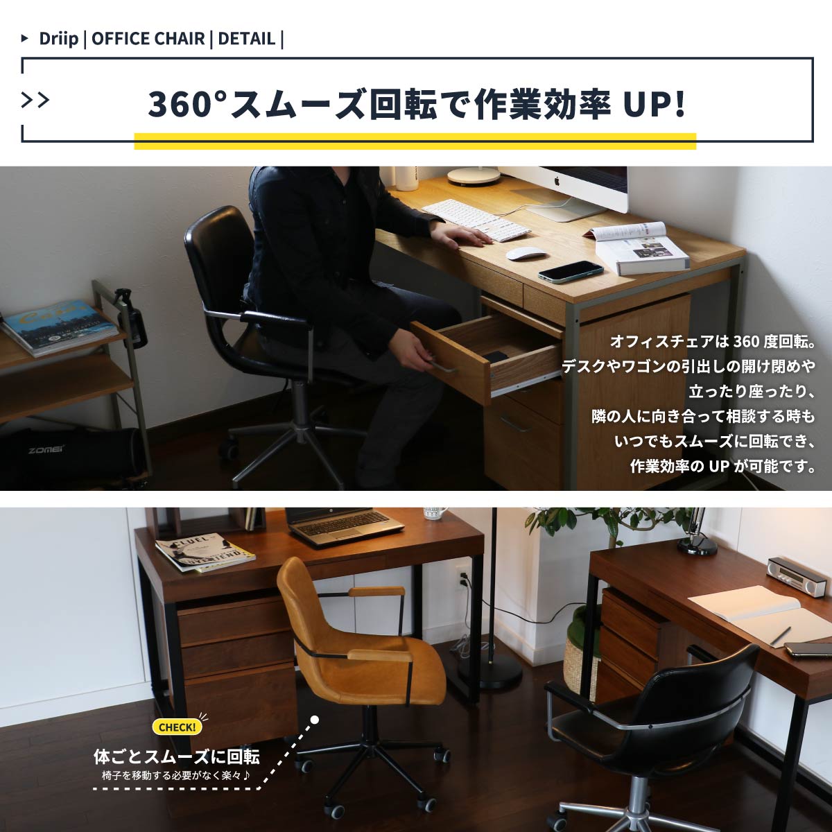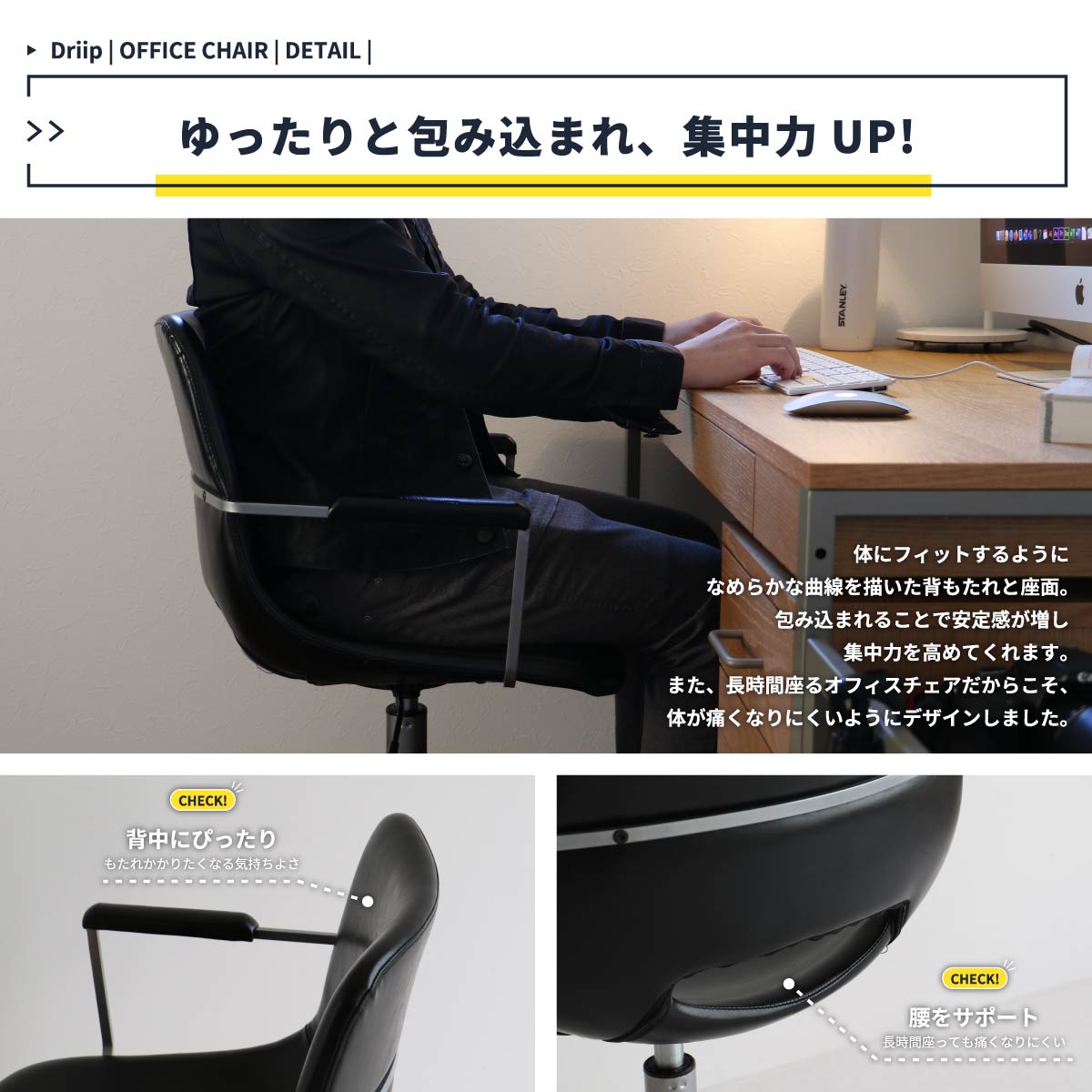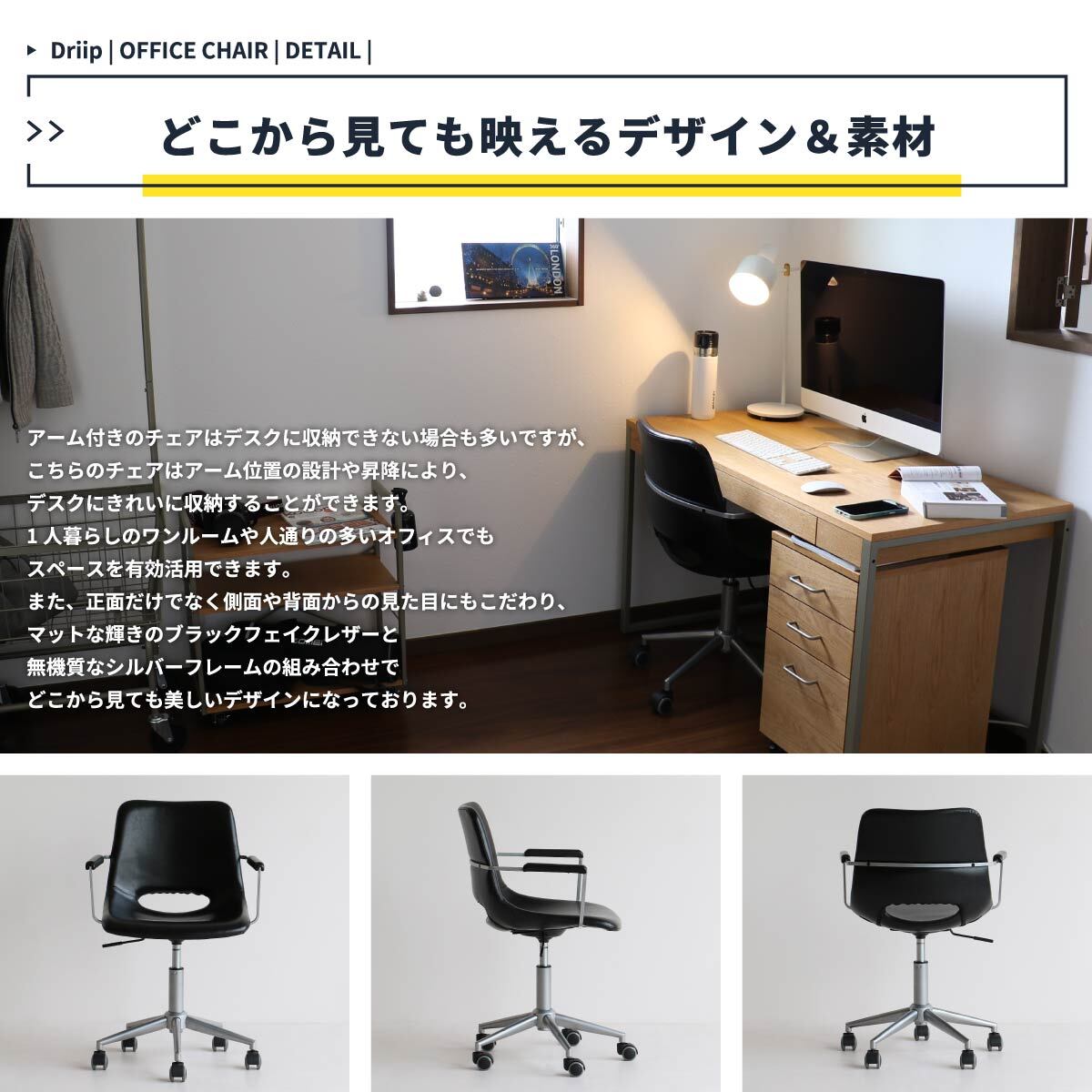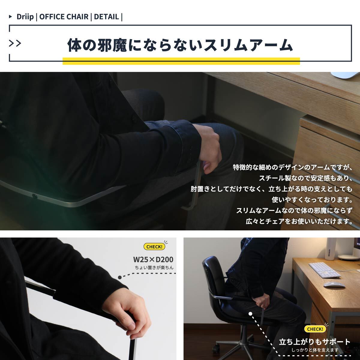 スリムなアームは体の邪魔になりにくく、立ち上がる時の支えとしても使える優秀なデスクチェアです。