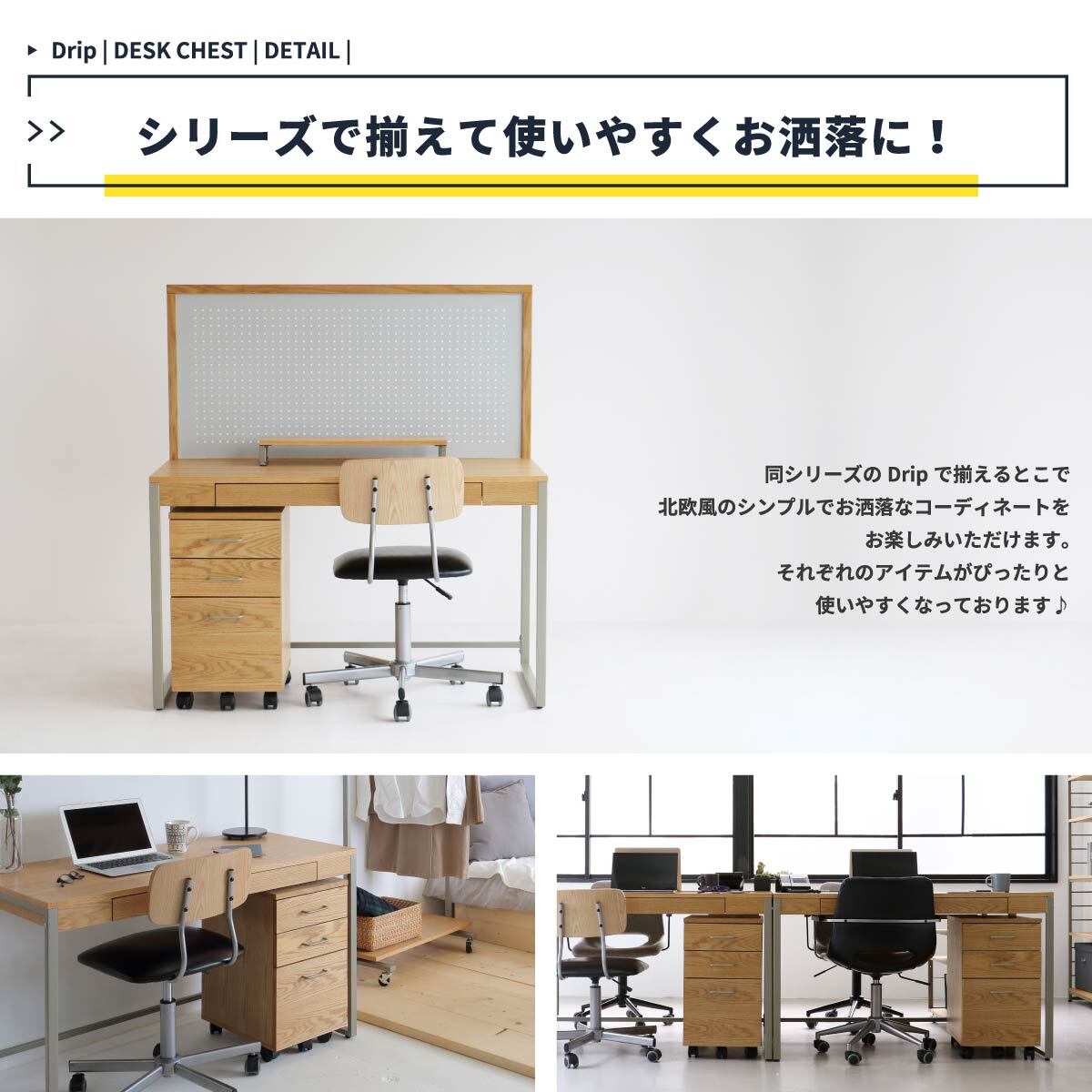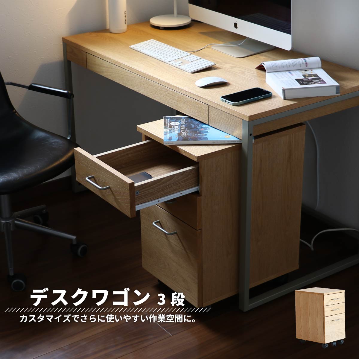 デスクワゴン サイドワゴン デスクチェスト サイドチェスト おすすめ おしゃれ 北欧 キャスター付き デスク収納 ナチュラル 木製 3段収納棚付き 背面化粧板 大容量