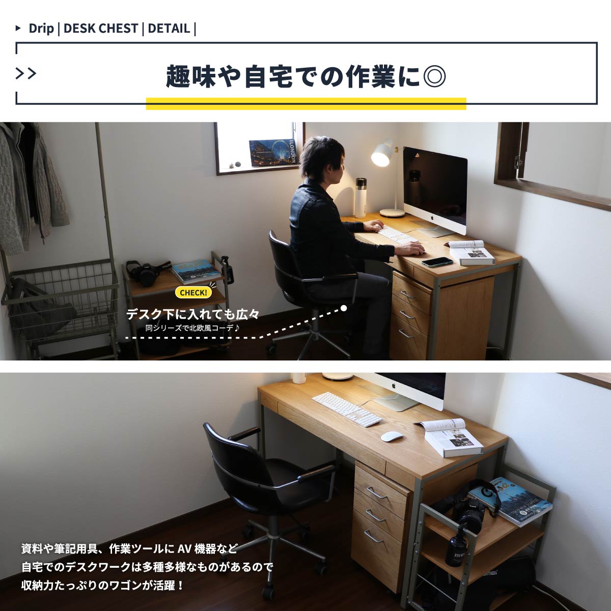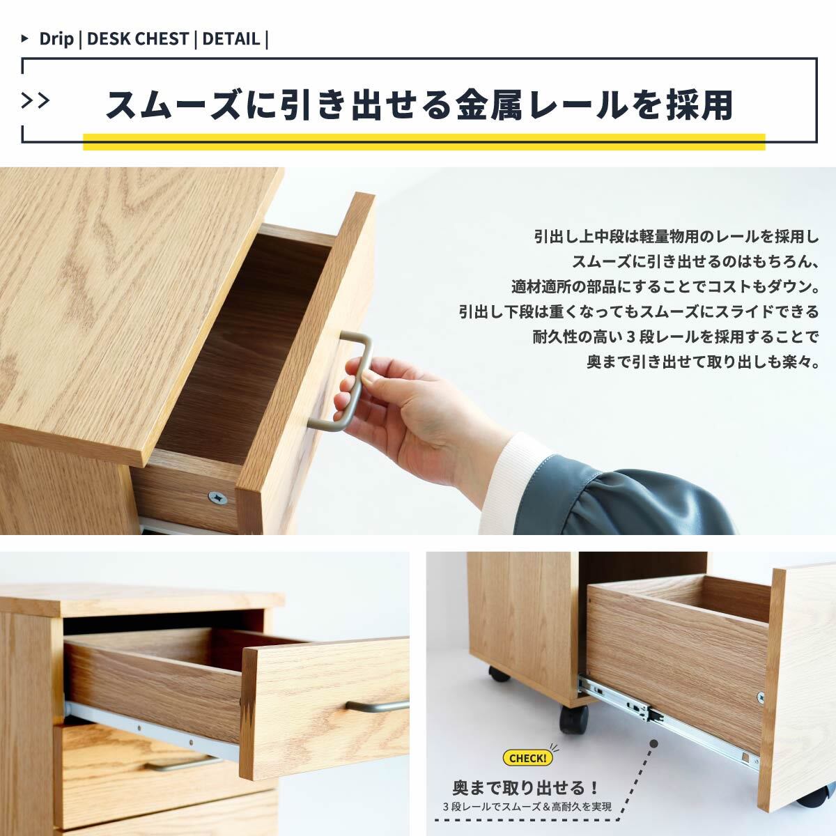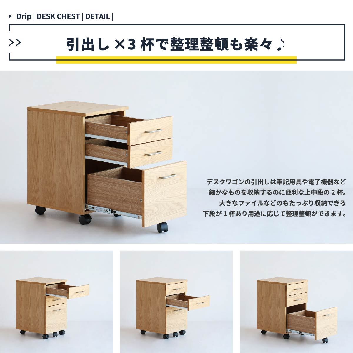 デスクワゴンの引き出しは細かなものを収納するのに便利な上中段の2杯と、大きなファイルも収納できる下段の合計3段があり、用途に応じて整理整頓ができます。