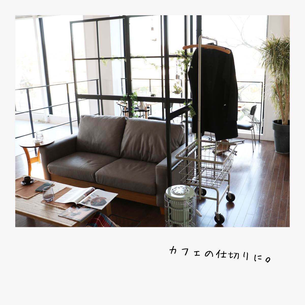 間仕切りとしてのご使用はもちろん、パーテーションはフレームのみの構造なので、ハンガーを掛けたり、観葉植物を飾ったりなど、おしゃれにコーディネートすることが可能です。
