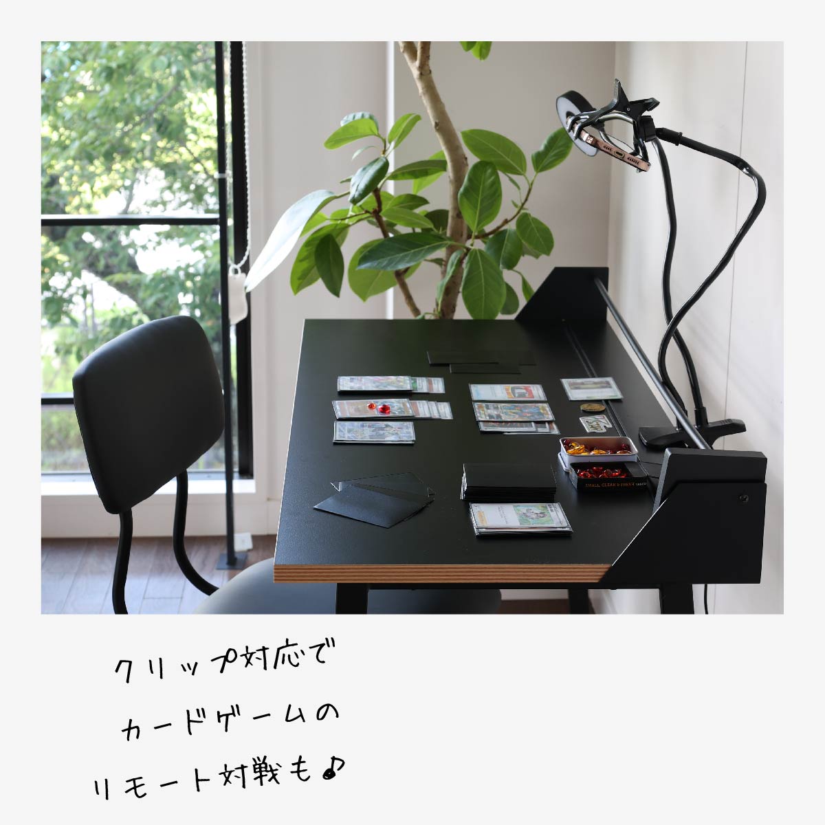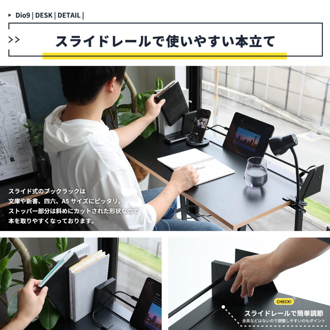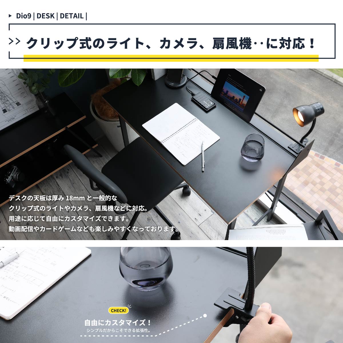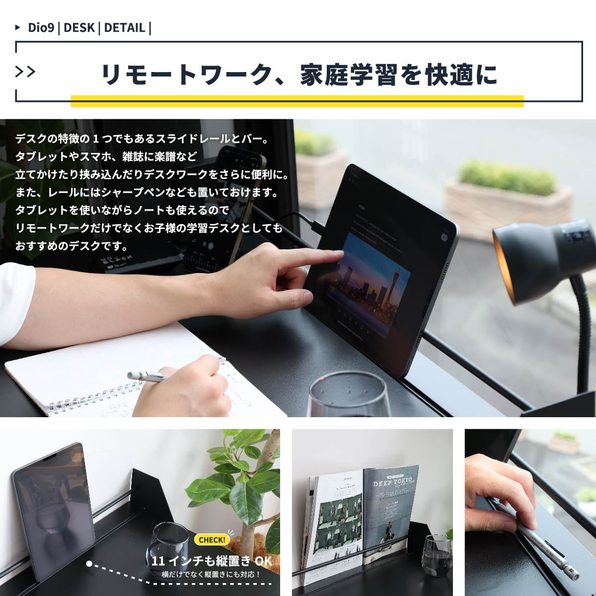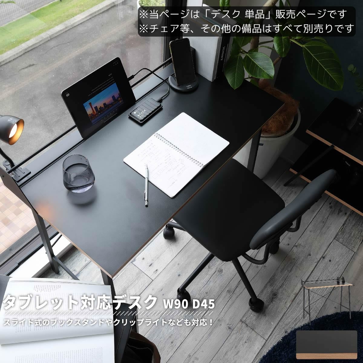 タブレットスタンド、ブックスタンド、クリップライト対応のリモートワークや学習におすすめのお洒落な90cm幅のコンパクトデスクです。