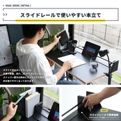 タブレットを立てかけて使用できるように天板にスライドレールとバーが付いており、タブレットを使いながらでも天板を広く使用可能です。