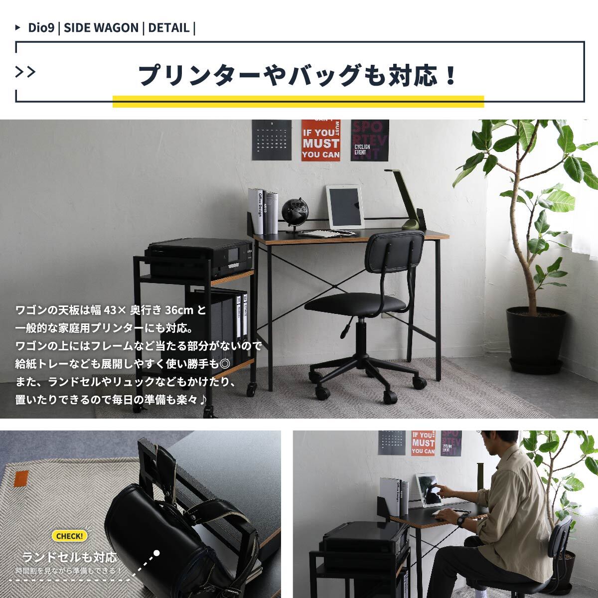 デスクサイドでの使用はもちろん、プリンターやランドセルなども置けるので、収納ラックとしても活躍するサイドワゴンです。