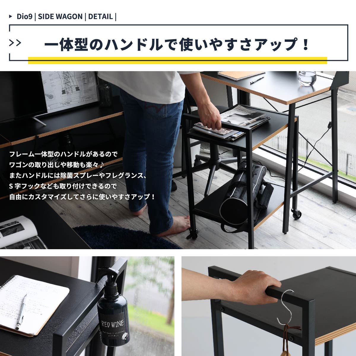 フレーム一体型のハンドルが付いているので、移動も簡単で、S字フックなどもかけることができます。
