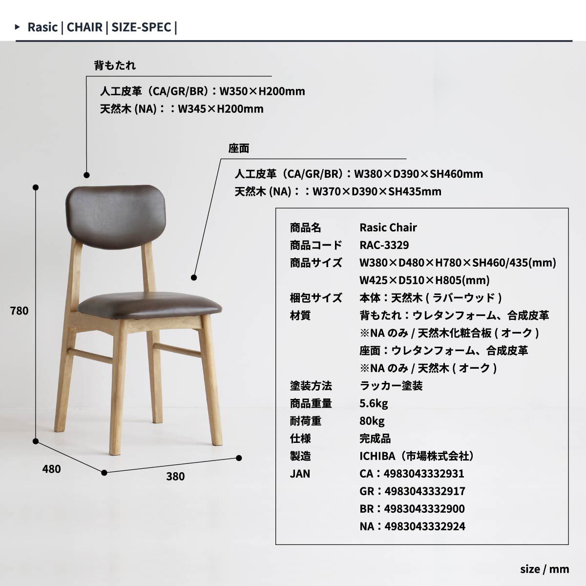 ・ナチュラル:幅38cm、奥行48cm、高さ78cm、座面高43.5cm