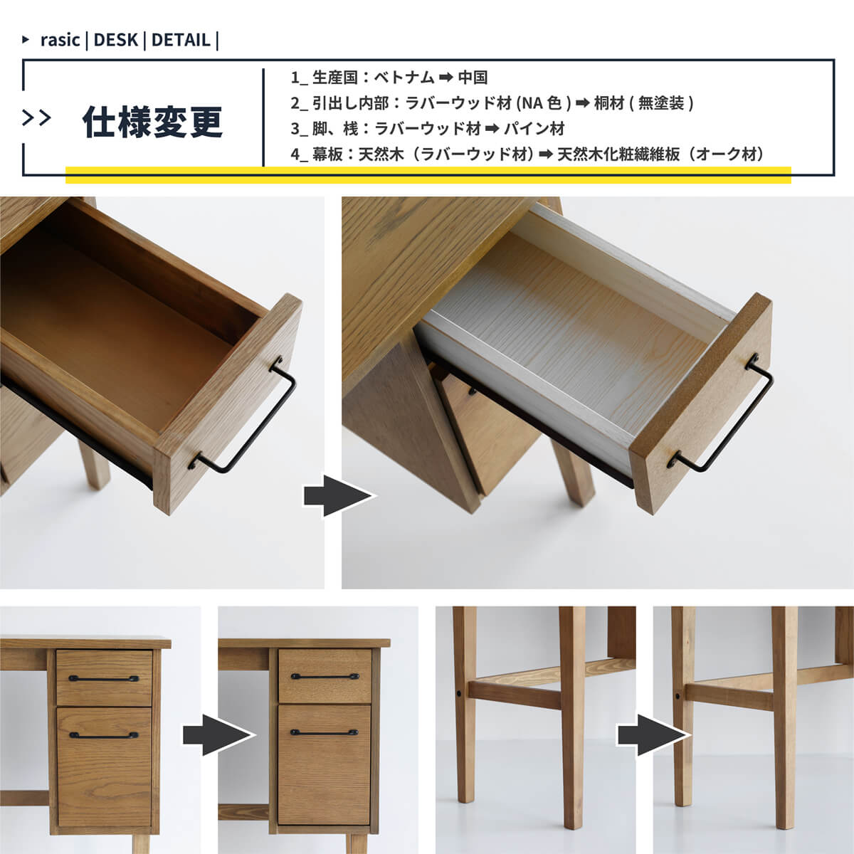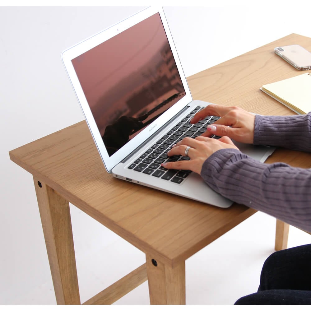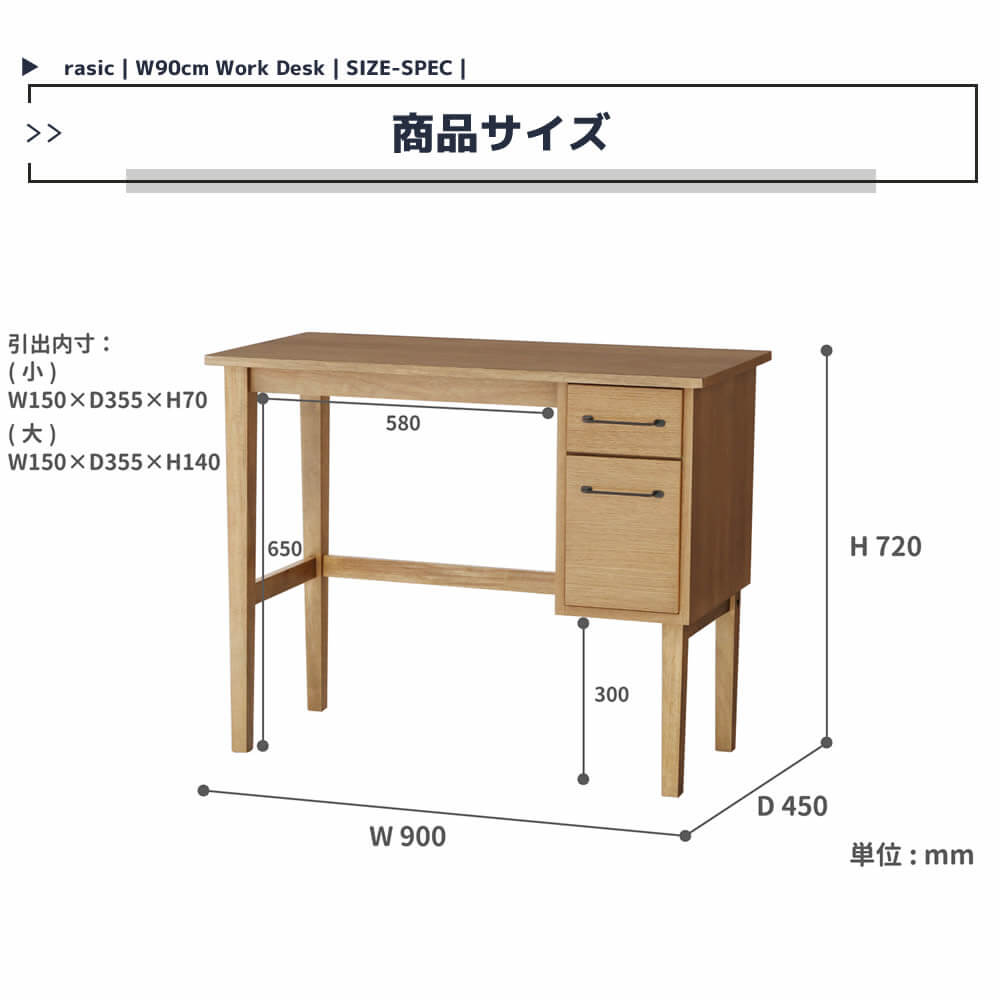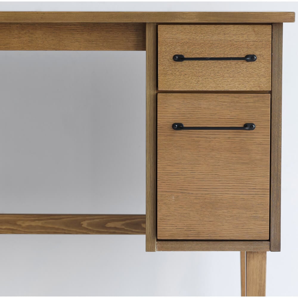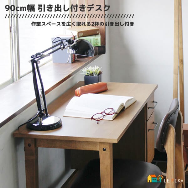 綺麗すぎない、粗さも含めて素材そのものの味わいを活かした引き出し付きの90cm幅デスクです。