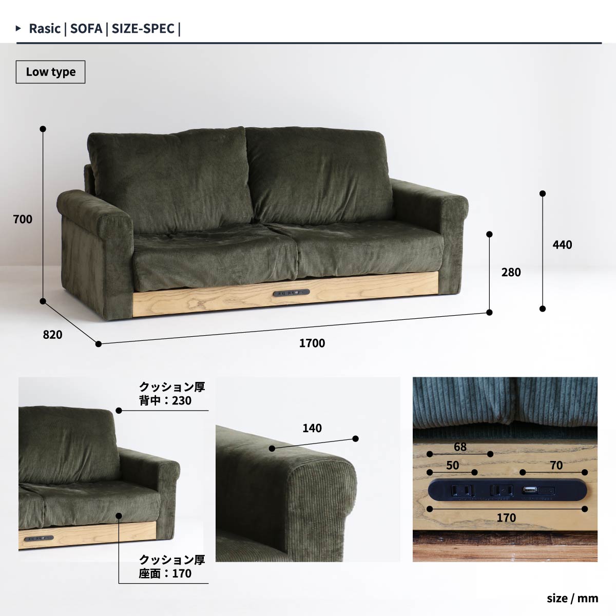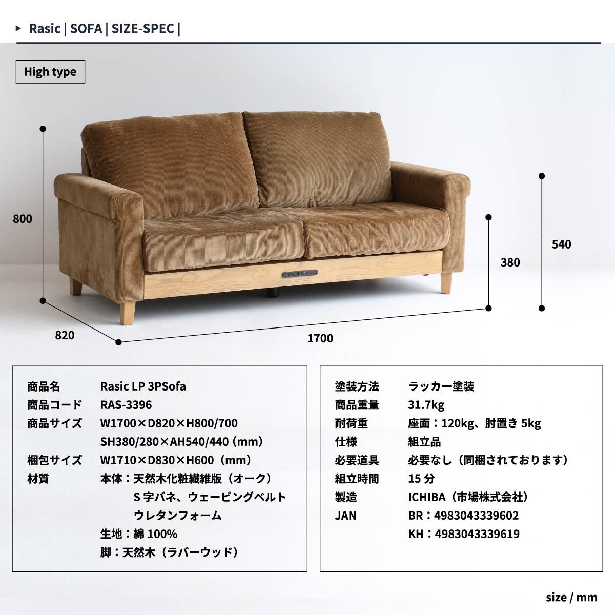 ■商品サイズ(約):幅170cm、奥行82cm、高さ80cm、座面高38cm