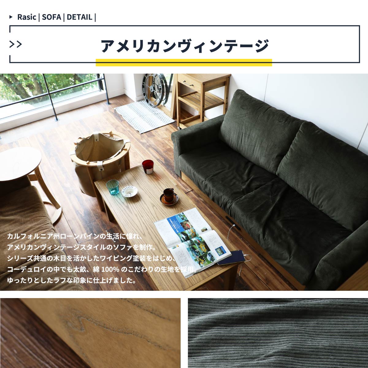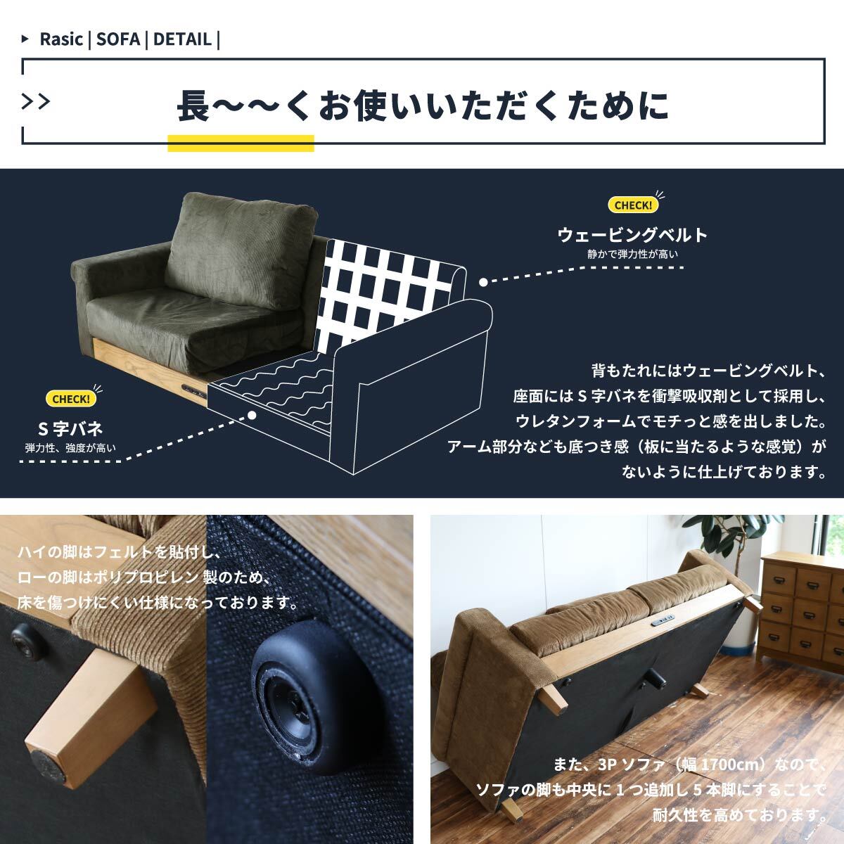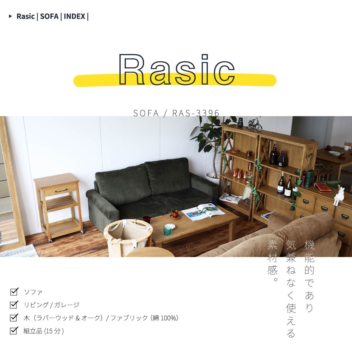 ■素材:Sバネ.ウェービングテープ、ウレタンフォーム、綿100%、天然木(ラバーウッド材)、天然木化粧繊維板(オーク材)