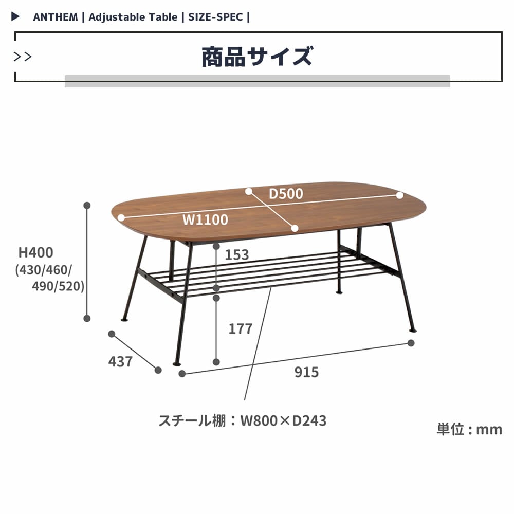 センターテーブル リビングテーブル ブラウン 茶色 110cm幅 カフェテーブル 棚板付テーブル 幅110cm 奥行50cm 高さ40cm 最大高さ52cm 高さ調節可能 おすすめ おしゃれ 北欧 ローテーブル 収納棚付きテーブル 机 テーブル インテリア 家具 新生活 一人暮らし 送料無料