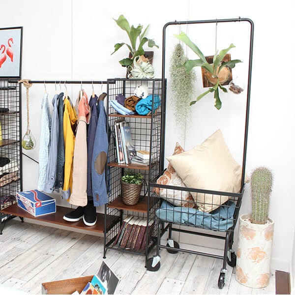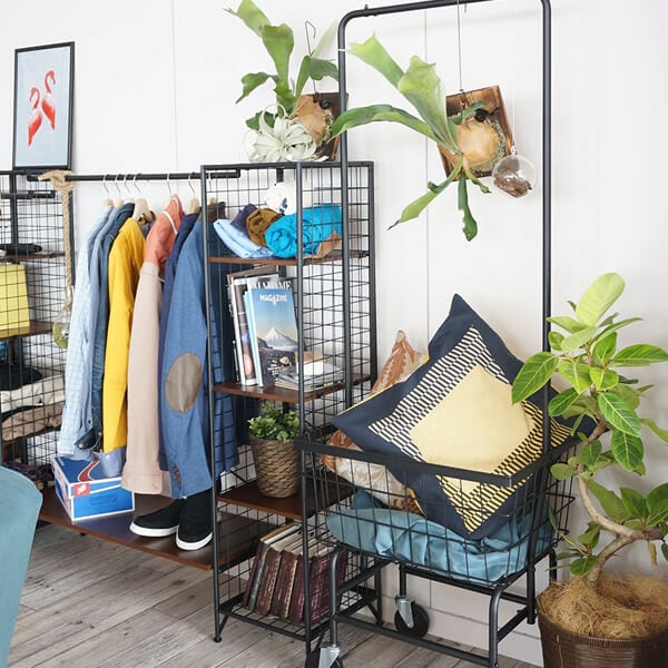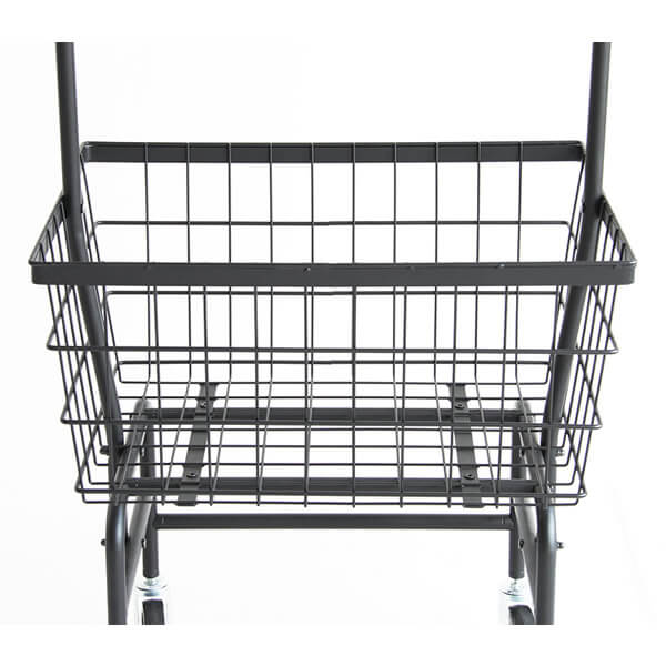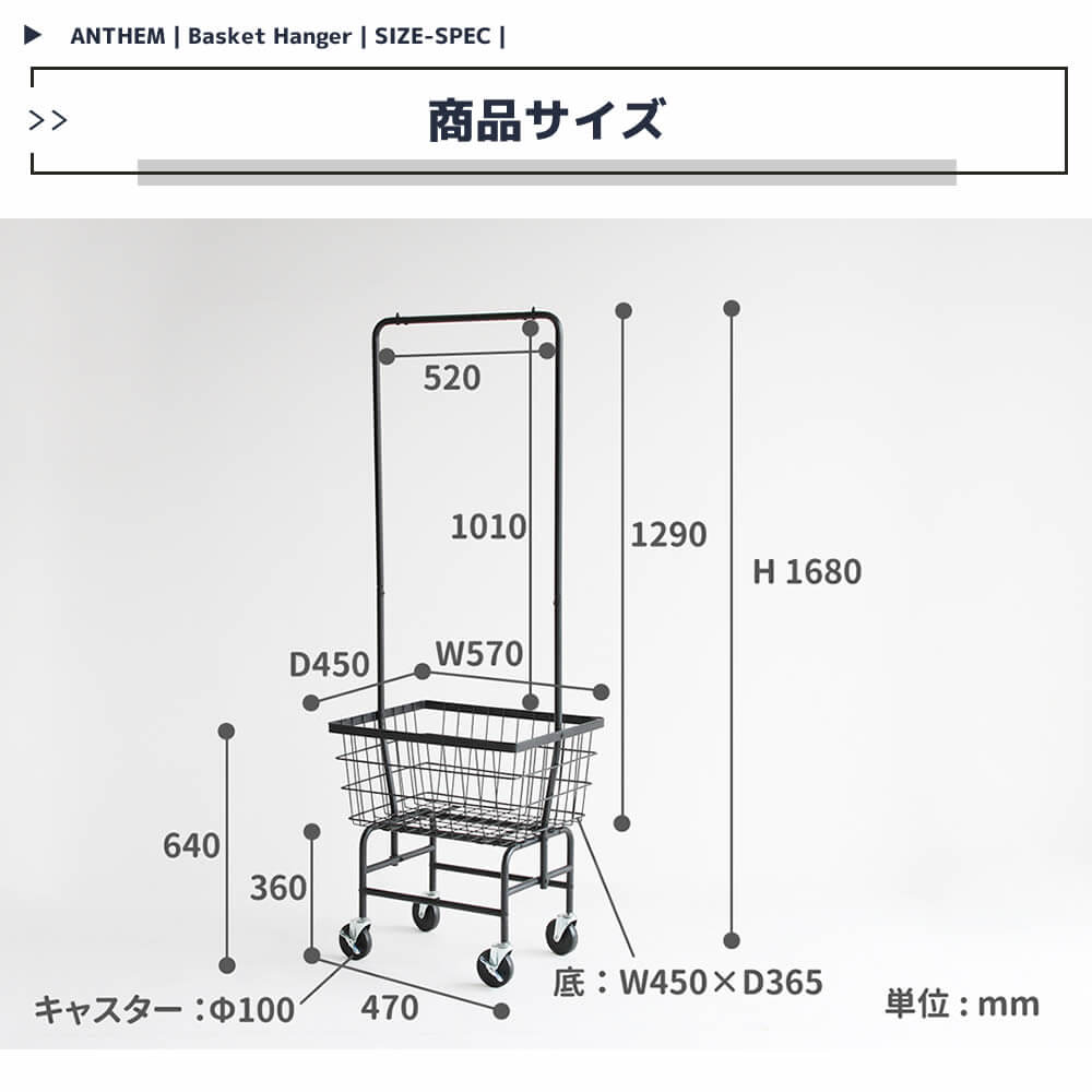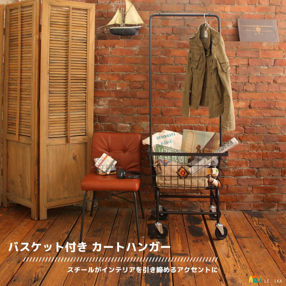 大きなキャスターつきでそのまま移動も簡単な、大容量のバスケットが付属したカートハンガーです。