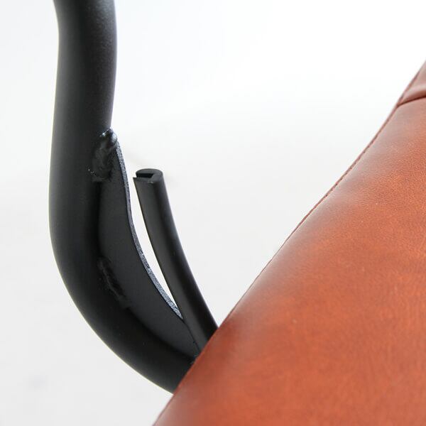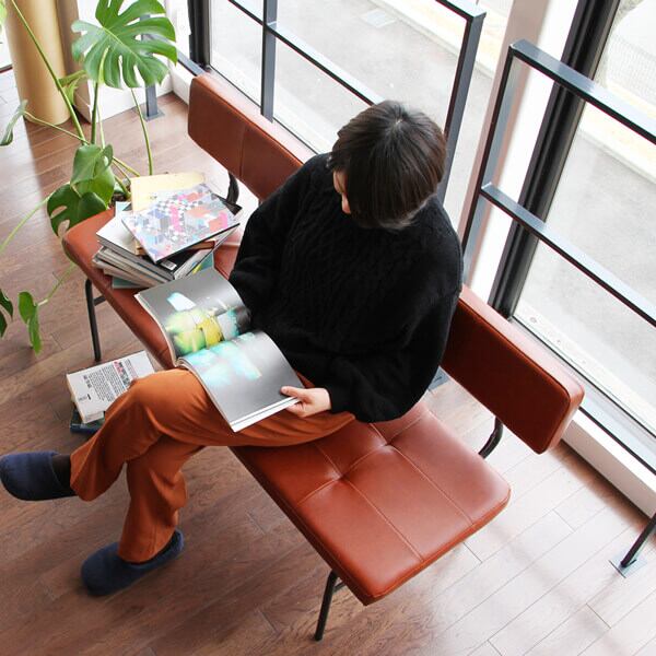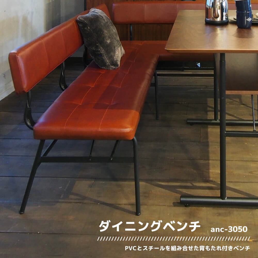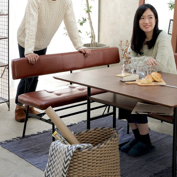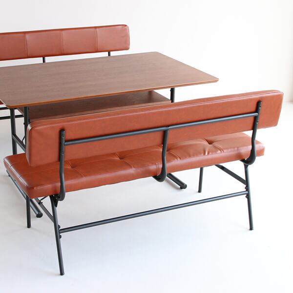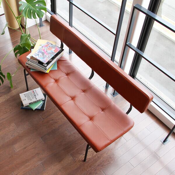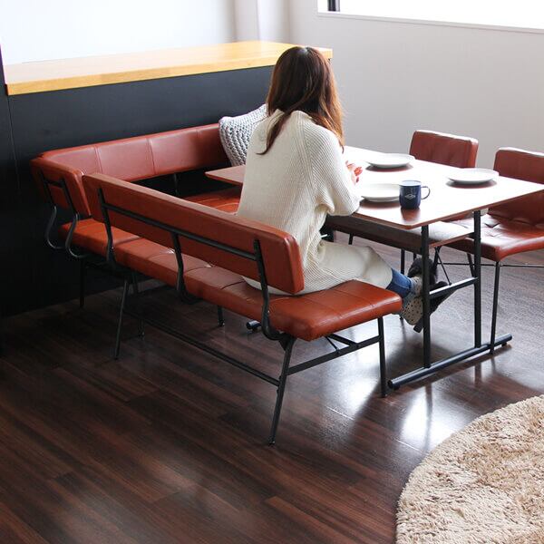 赤みがかったブラウンがカフェ風の空間を演出してくれるPVCとスチールを組み合せた背もたれ付きダイニングベンチです。