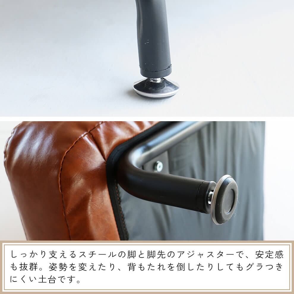 スチール脚の脚先にはアジャスターが付いているので、安定感も良く、背もたれを倒したり、姿勢を変えたりしてもグラつきにくい土台です。