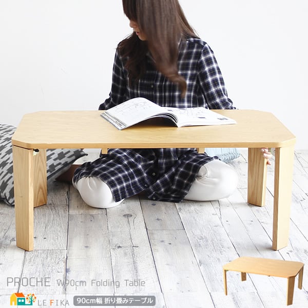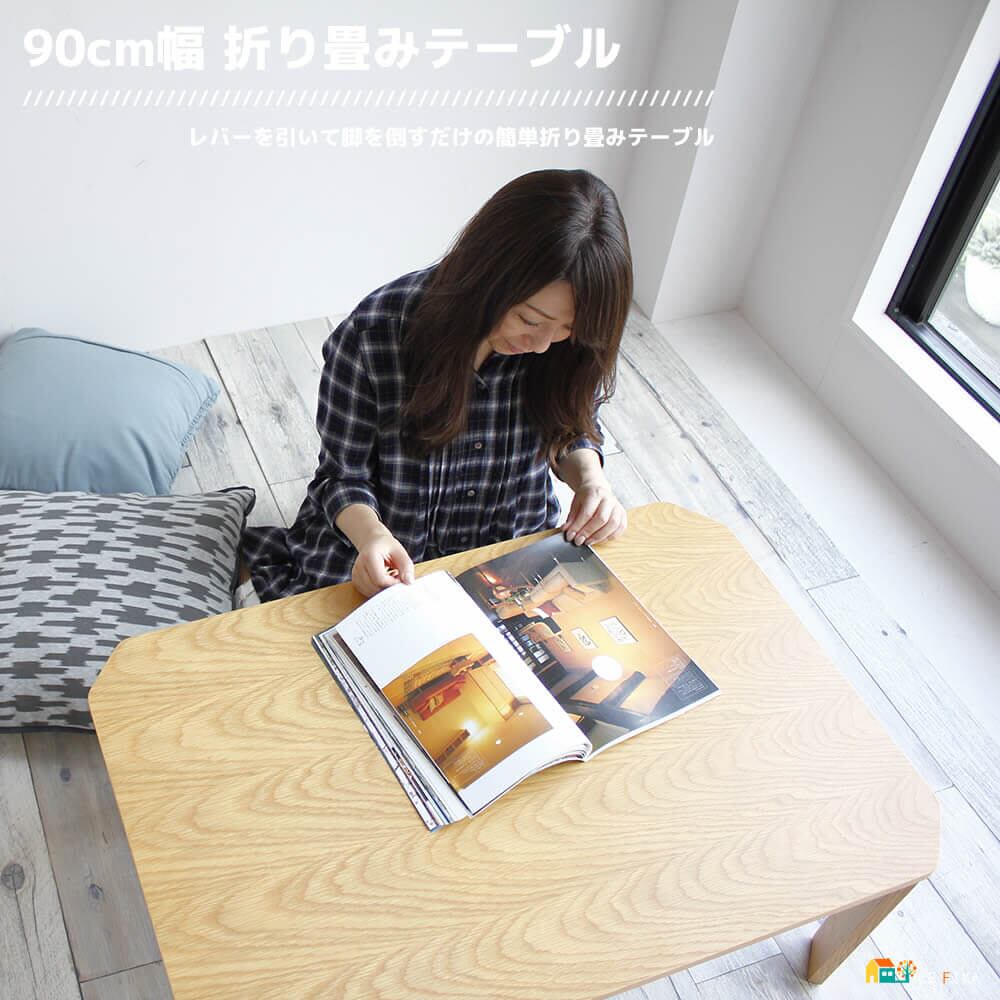 天然木の風合いがやさしい折りたたみできるコンパクトな90cm幅の折り畳み式リビングテーブルです。