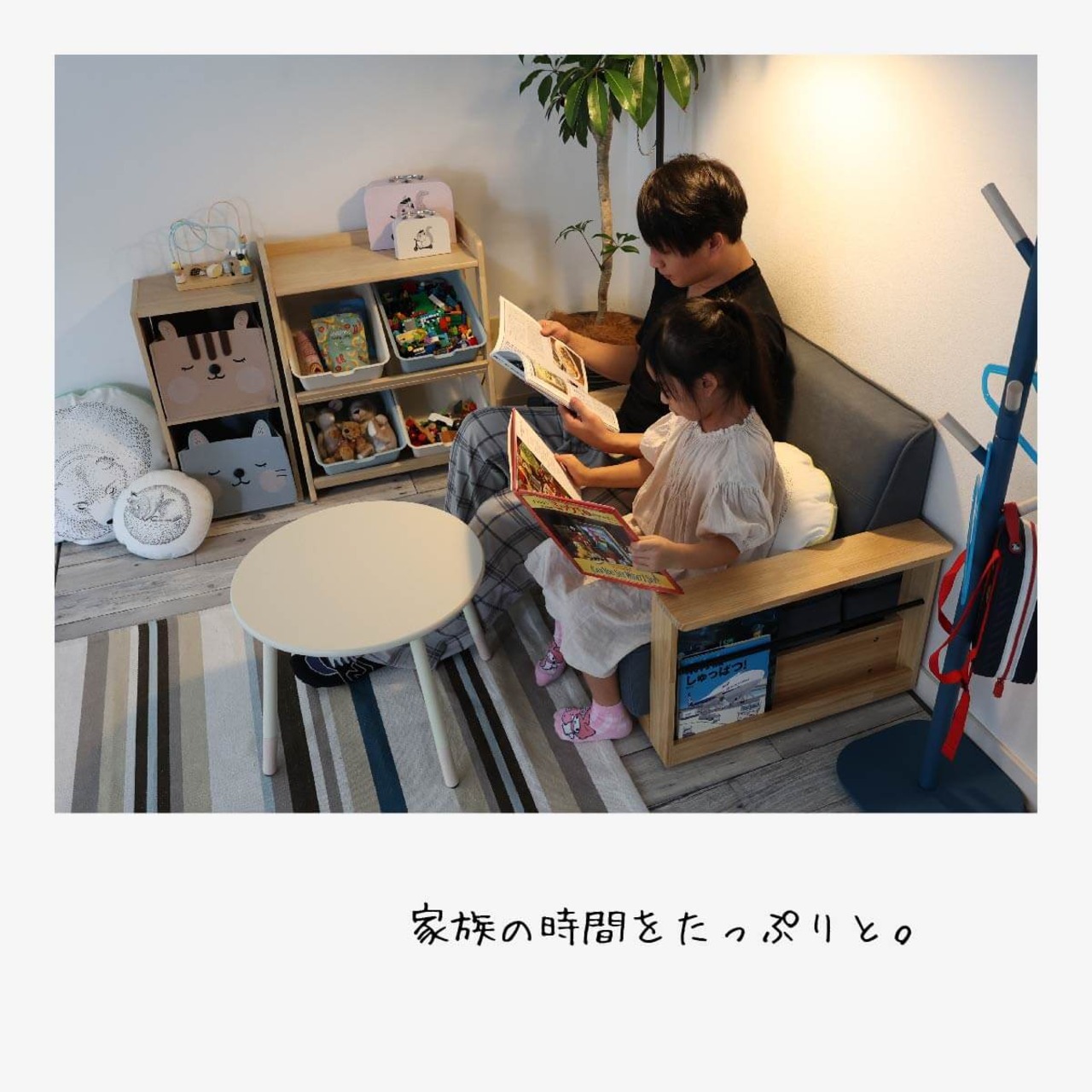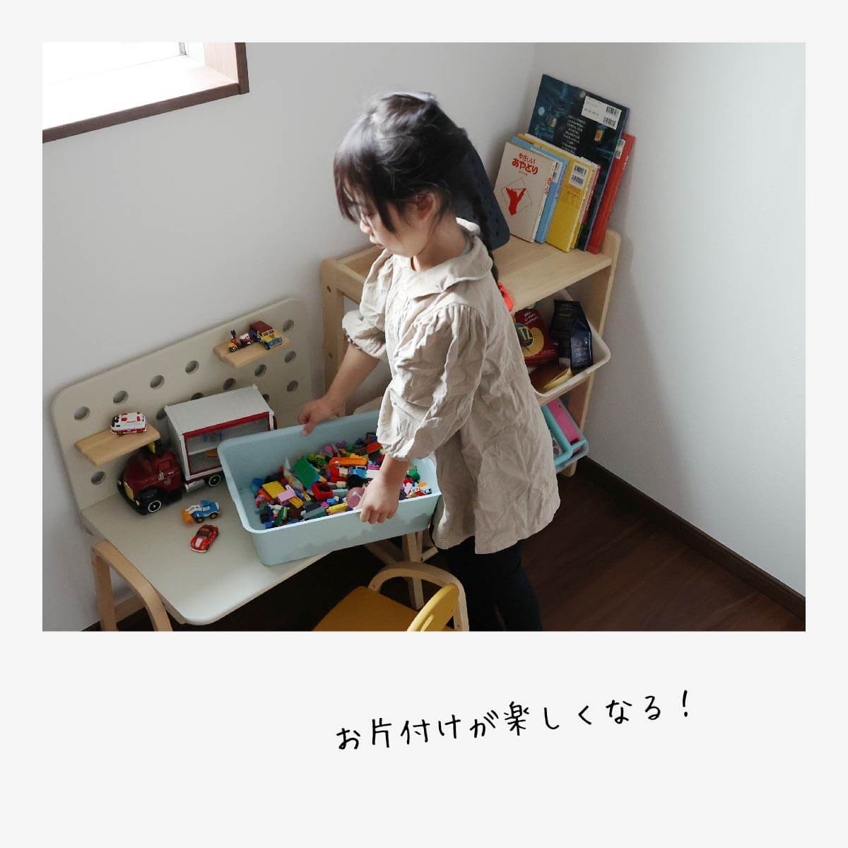 青と白のおもちゃ箱を自由に組み合わせて楽しくお片付けできるから習慣になり整理整頓が身に付くこどもの成長を応援するトイボックスラックです。