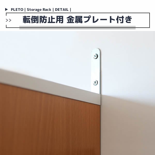 転倒防止の金属プレートがついており壁と固定できるため、壁際に設置する際にも安心です。