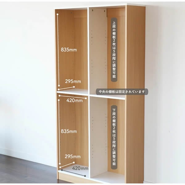上下段左右あわせて8枚の棚板が可動棚仕様なので、収納するものに合わせてスペースを確保できます。(※中央棚板は固定棚となります。)