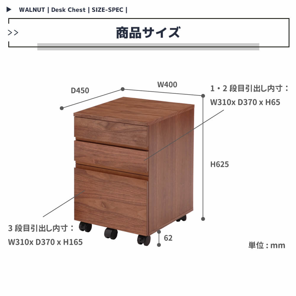 どこか落ち着いた温かみのある雰囲気の40cm幅のデスクチェスト単品です。