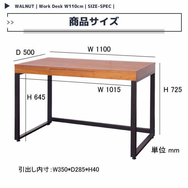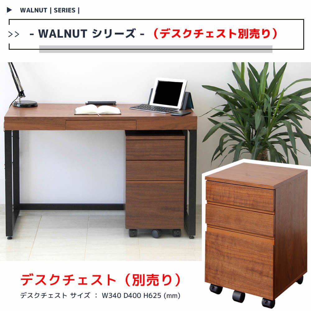 ウォールナットの木目が特徴的なデザインの、どこか落ち着いた温かみのある雰囲気の110cm幅のワークデスクです。