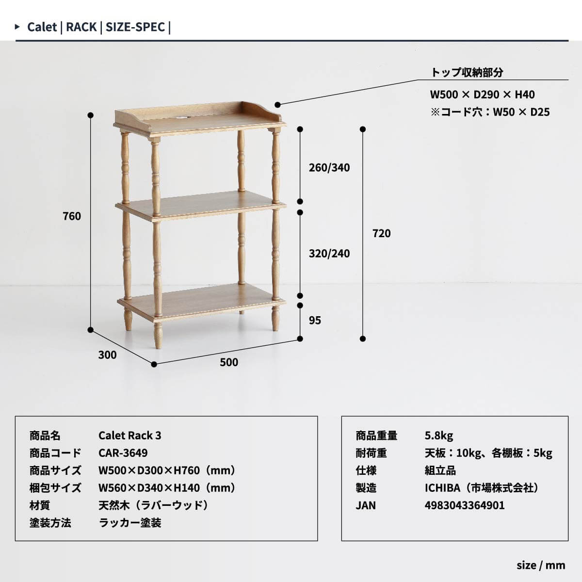 ■耐荷重(約):天板10kg、棚板(各)5kg