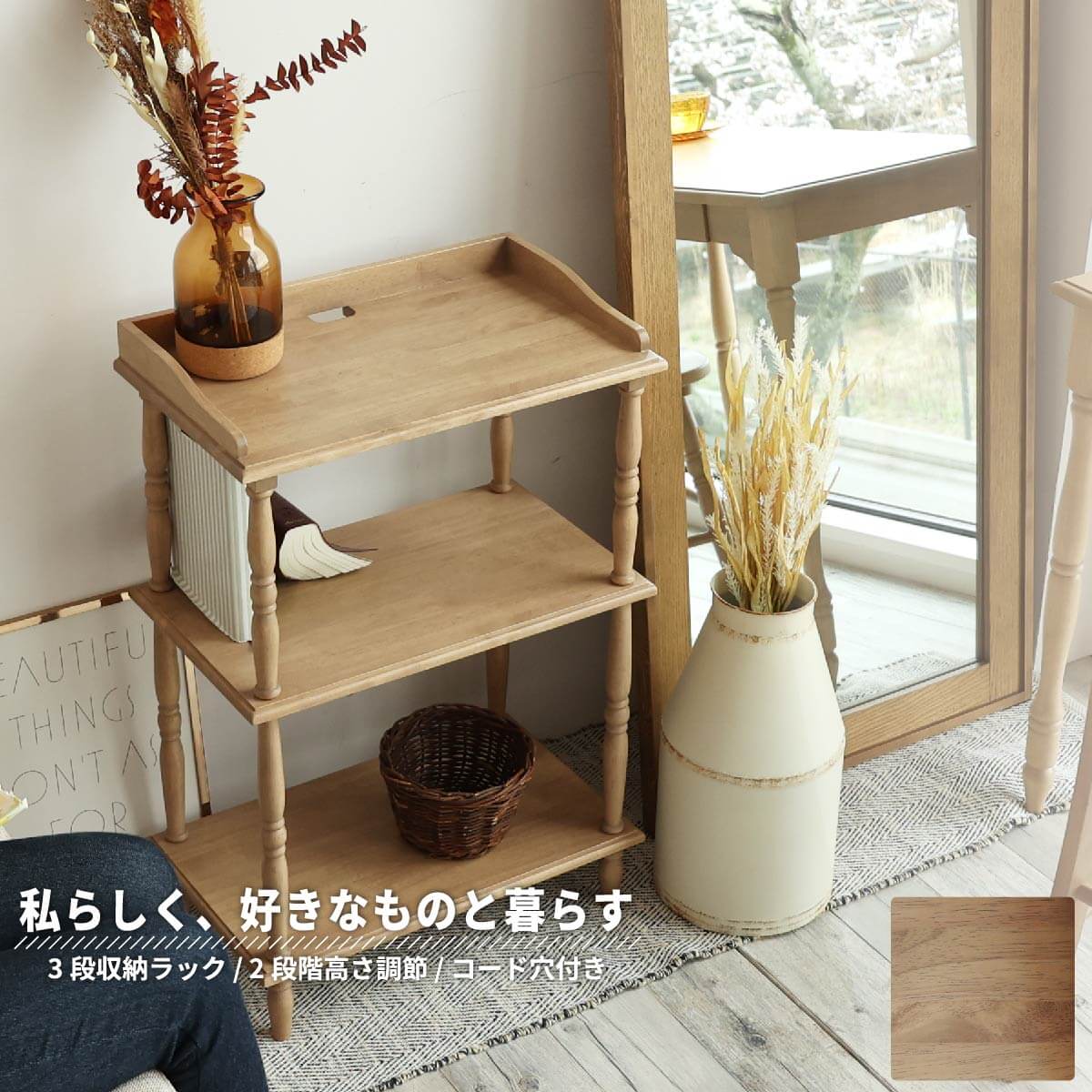 天然素材とトレンドのカラーを組み合わせた大人可愛い50cm幅の3段収納ラックです。