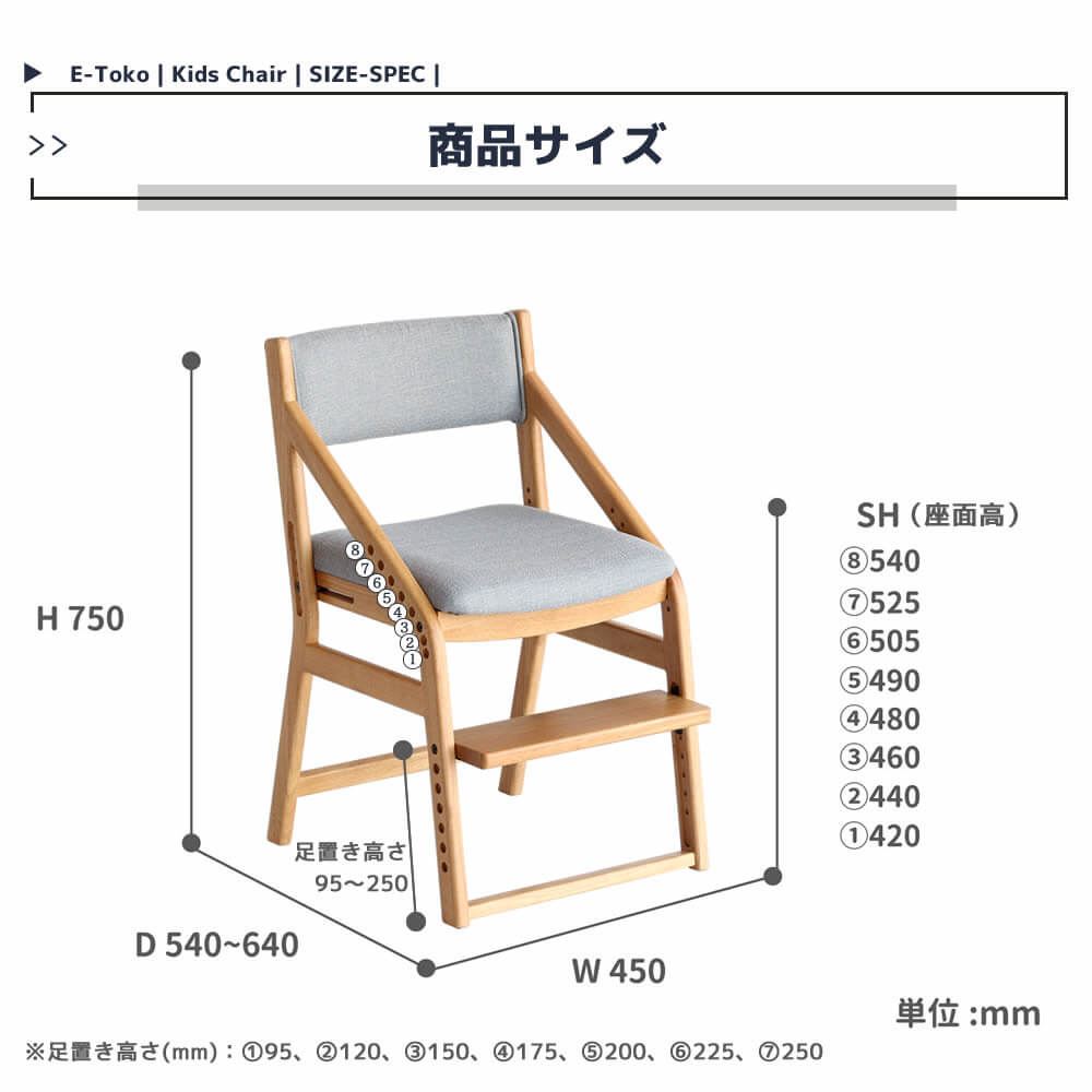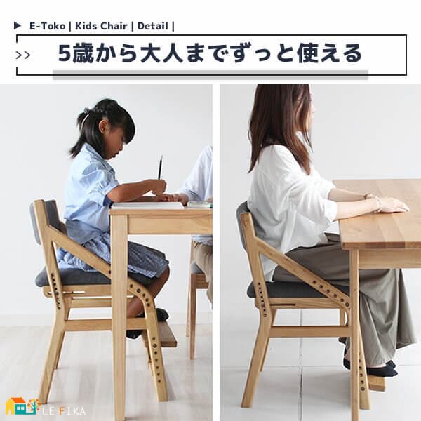 身体の成長に合わせて適切な高さと距離を調整できる5歳から大人まで成長に合わせて使用可能な子供チェアです。