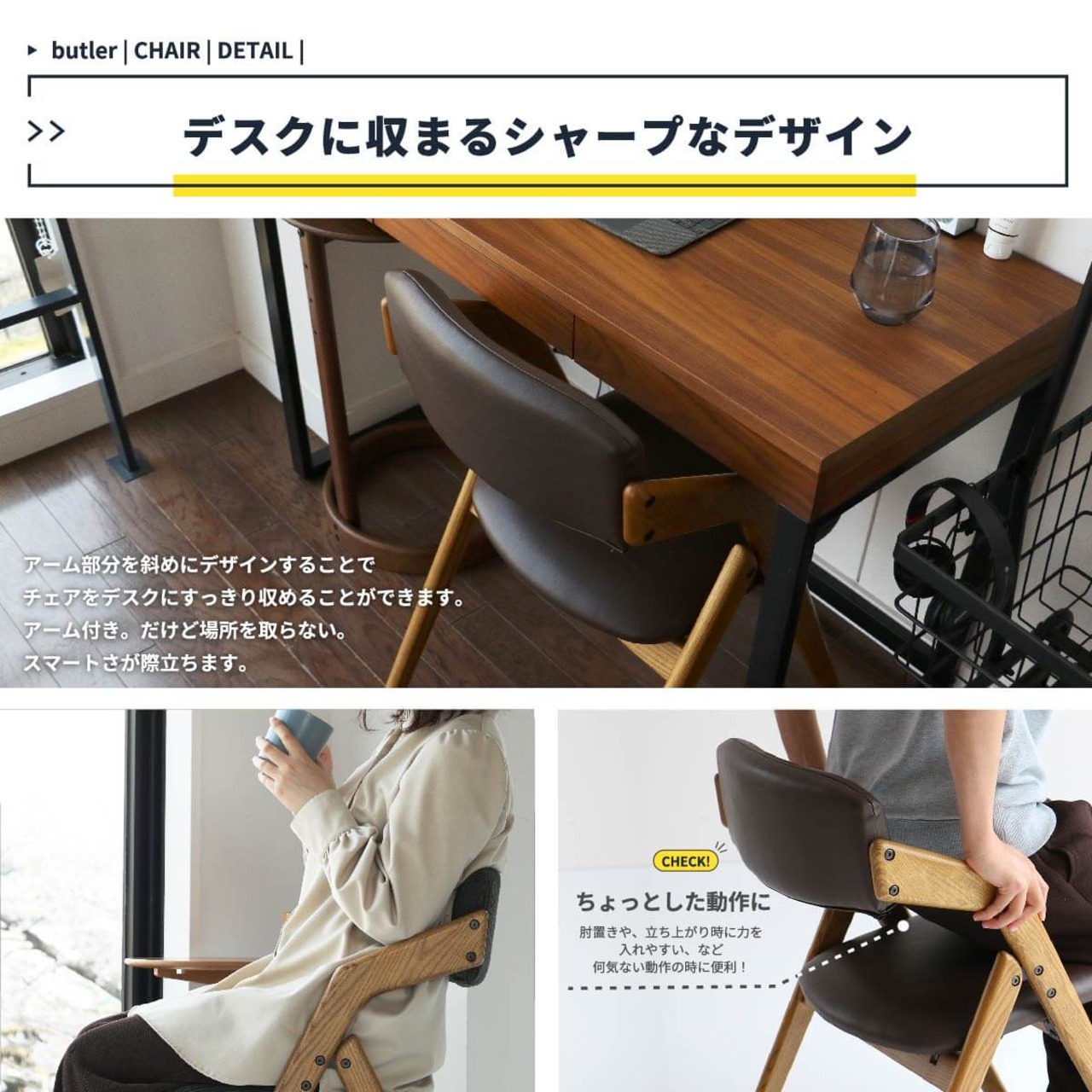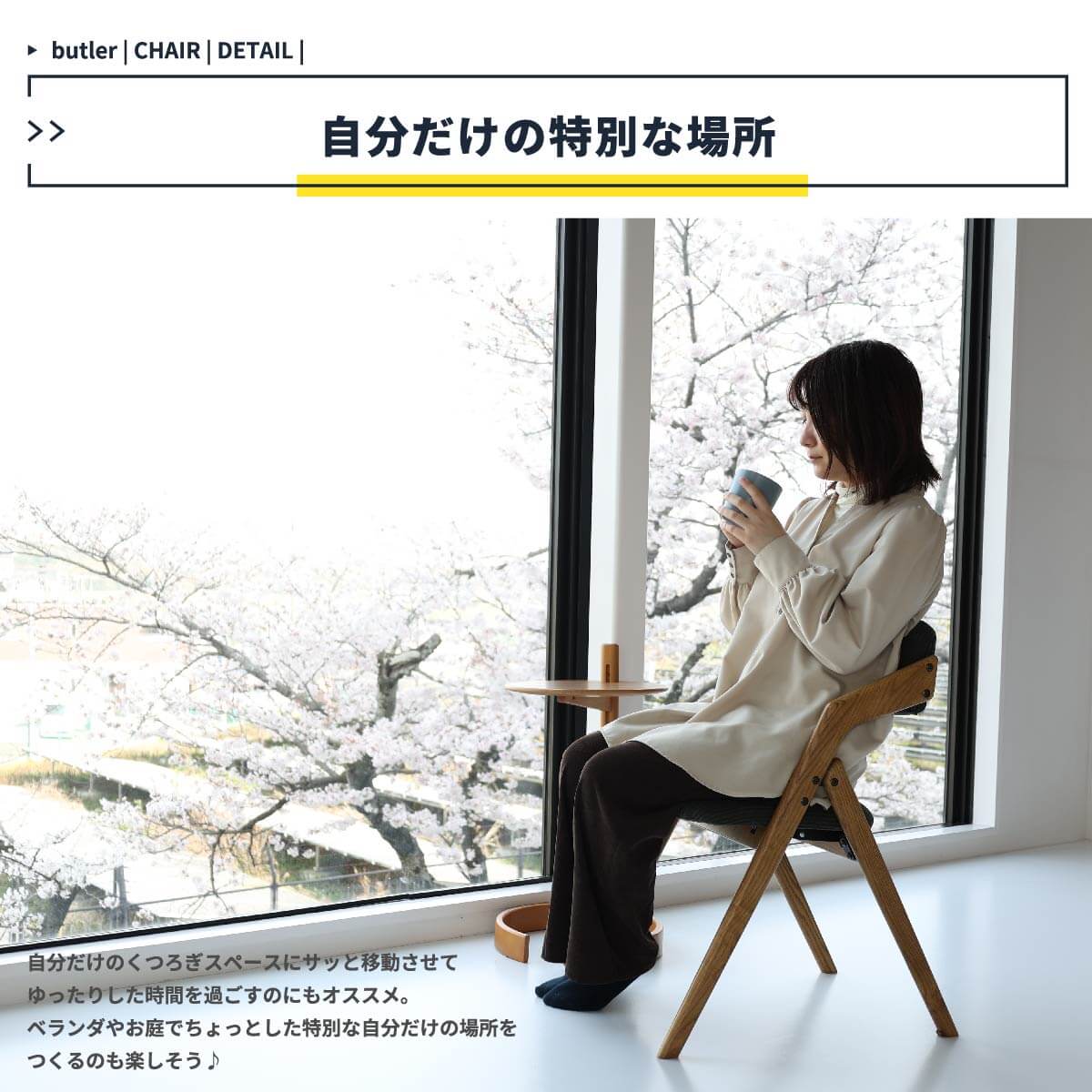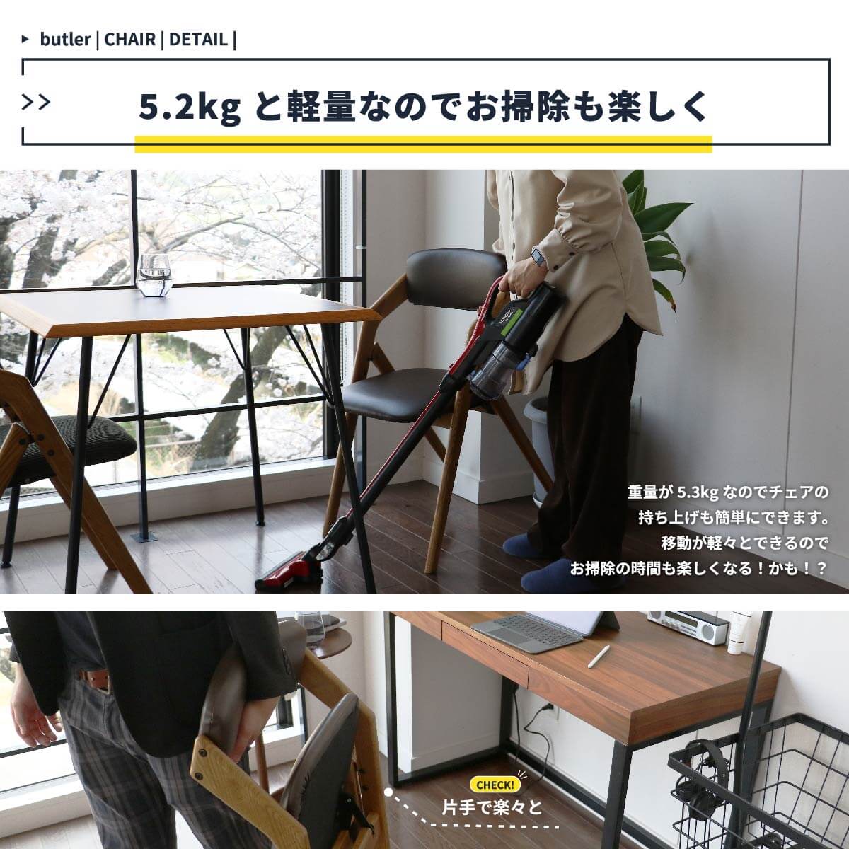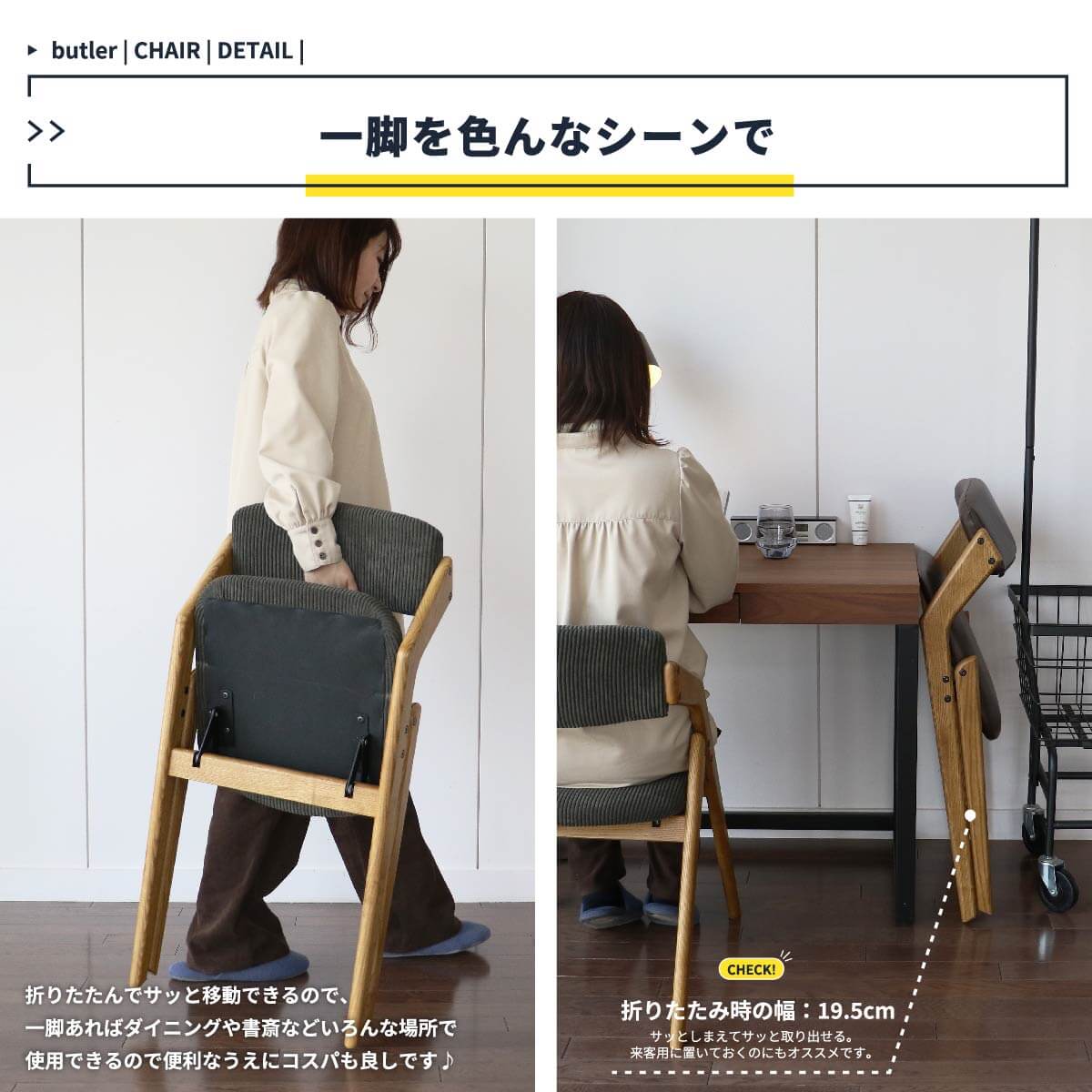 折り畳み式なので、移動も簡単でダイニングチェアとしてはもちろん、書斎でのデスクチェアとしても活躍してくれる折り畳みチェアです。
