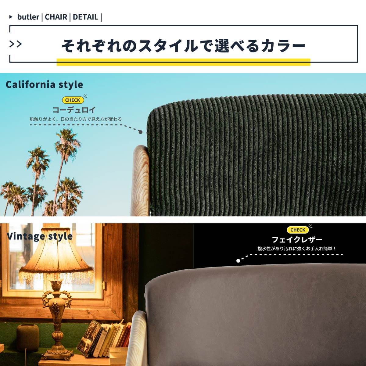 ブラウン張地は合皮、カーキ張地はコーデュロイとカラーによって素材が異なります。