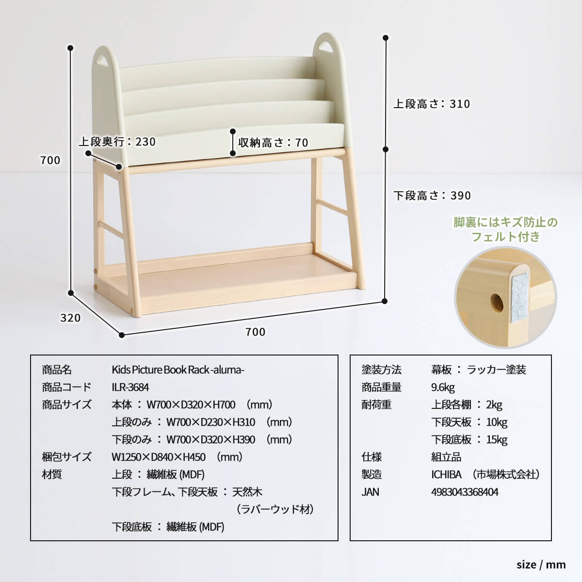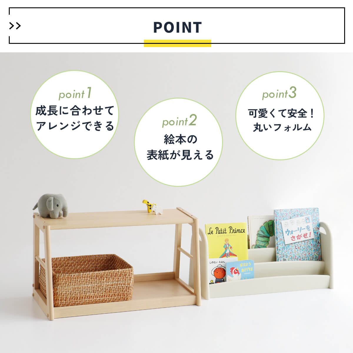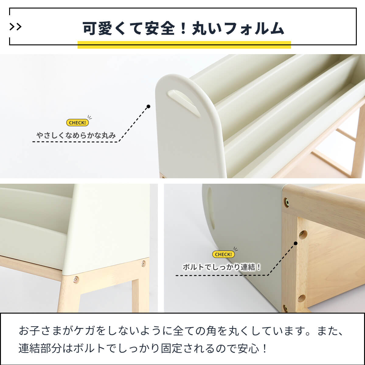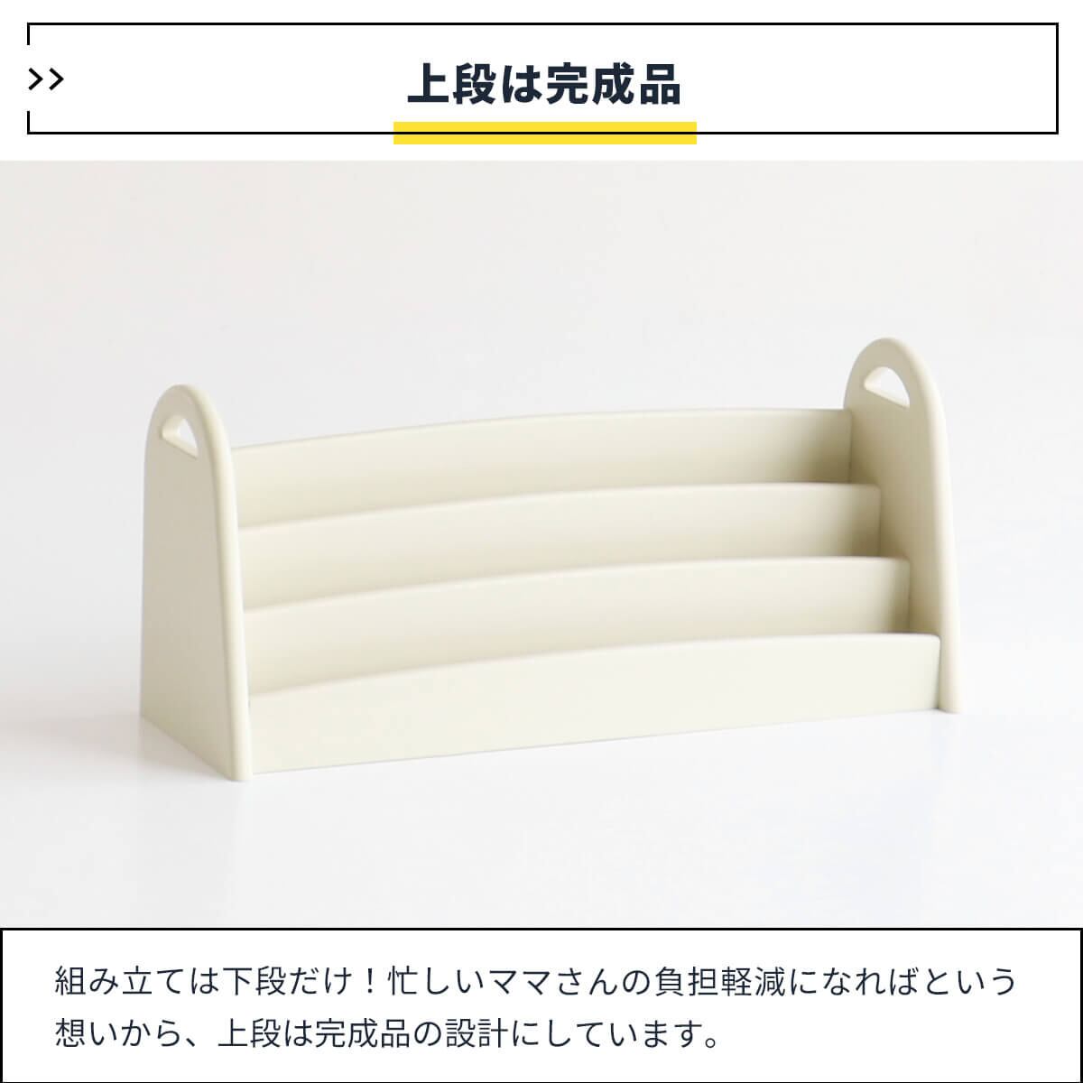 上段ラックは絵本の表紙が見えるよう設計されており、下段はおもちゃ収納や日常のファイルなどを収納できる仕様です。