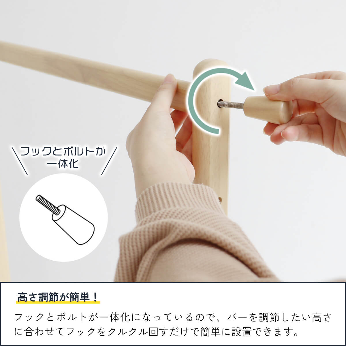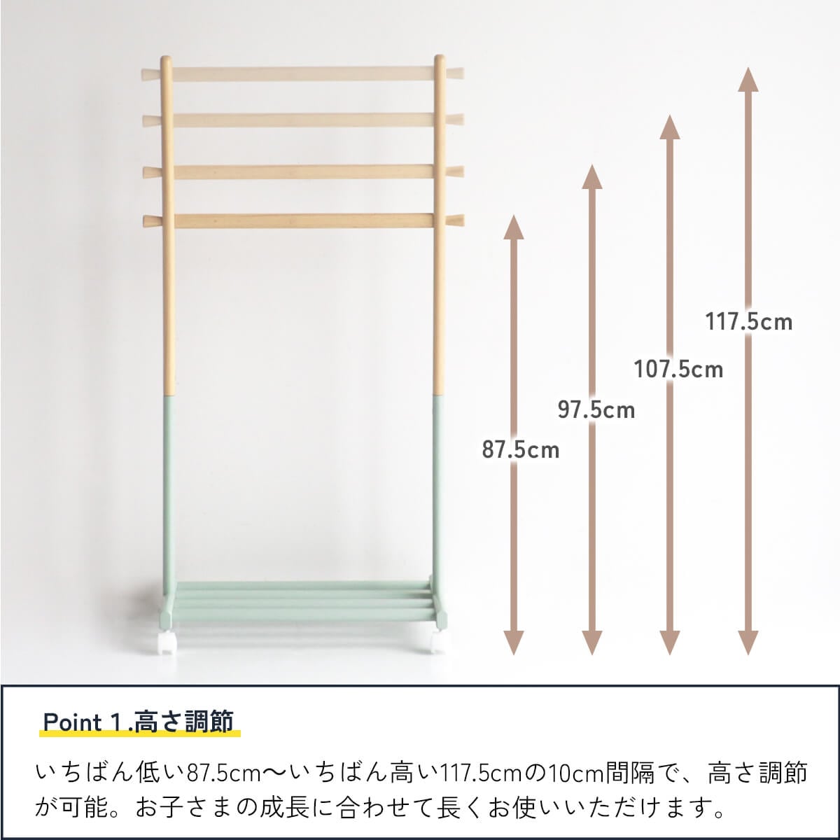 キャスター付きなので移動も簡単で、子供の目線に合わせてハンガーバーの高さを4段階調節が可能です。