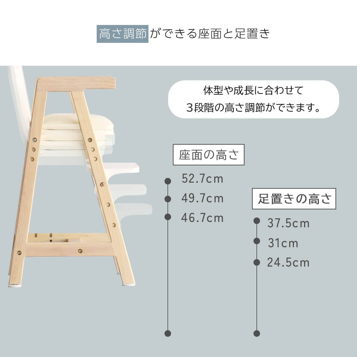お子様の成長に合わせて座面と足置きはそれぞれ3段階の高さ調節が可能です。