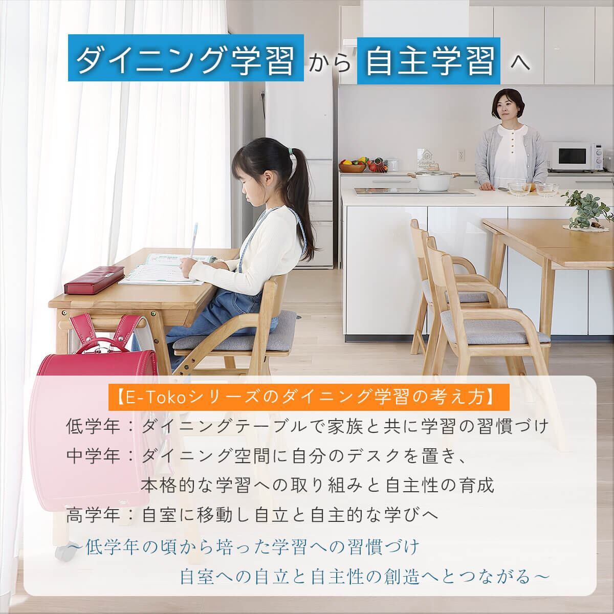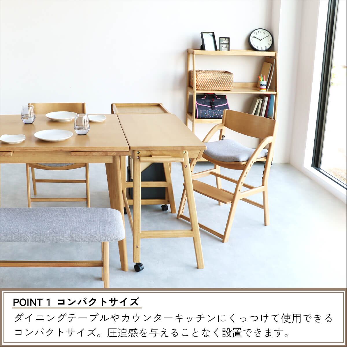 ダイニングは頻繁に掃除などを行う場所なので、移動しやすいよう、デスク奥側の脚はキャスターが付いている仕様の勉強机です。