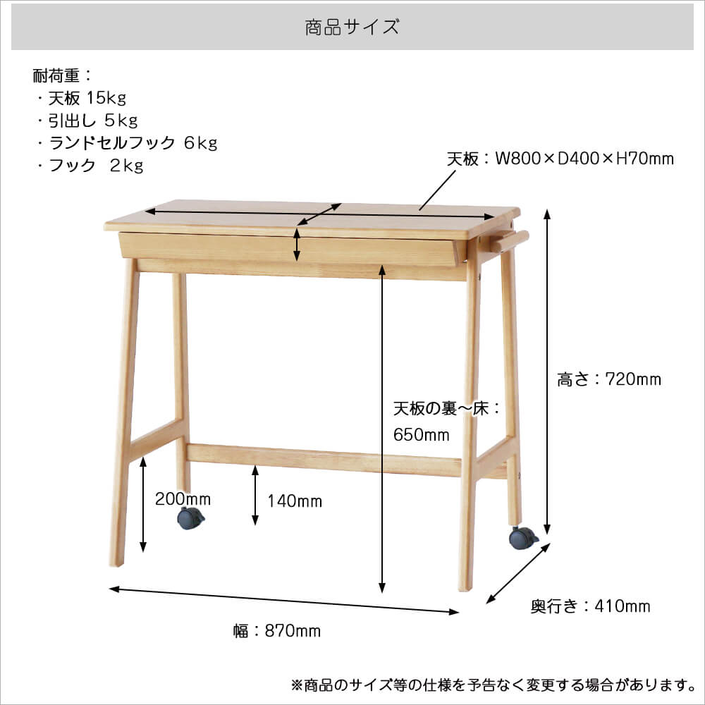 ■耐荷重(約):天板15kg、引き出し5kg、ランドセルフック6kg、フック2kg