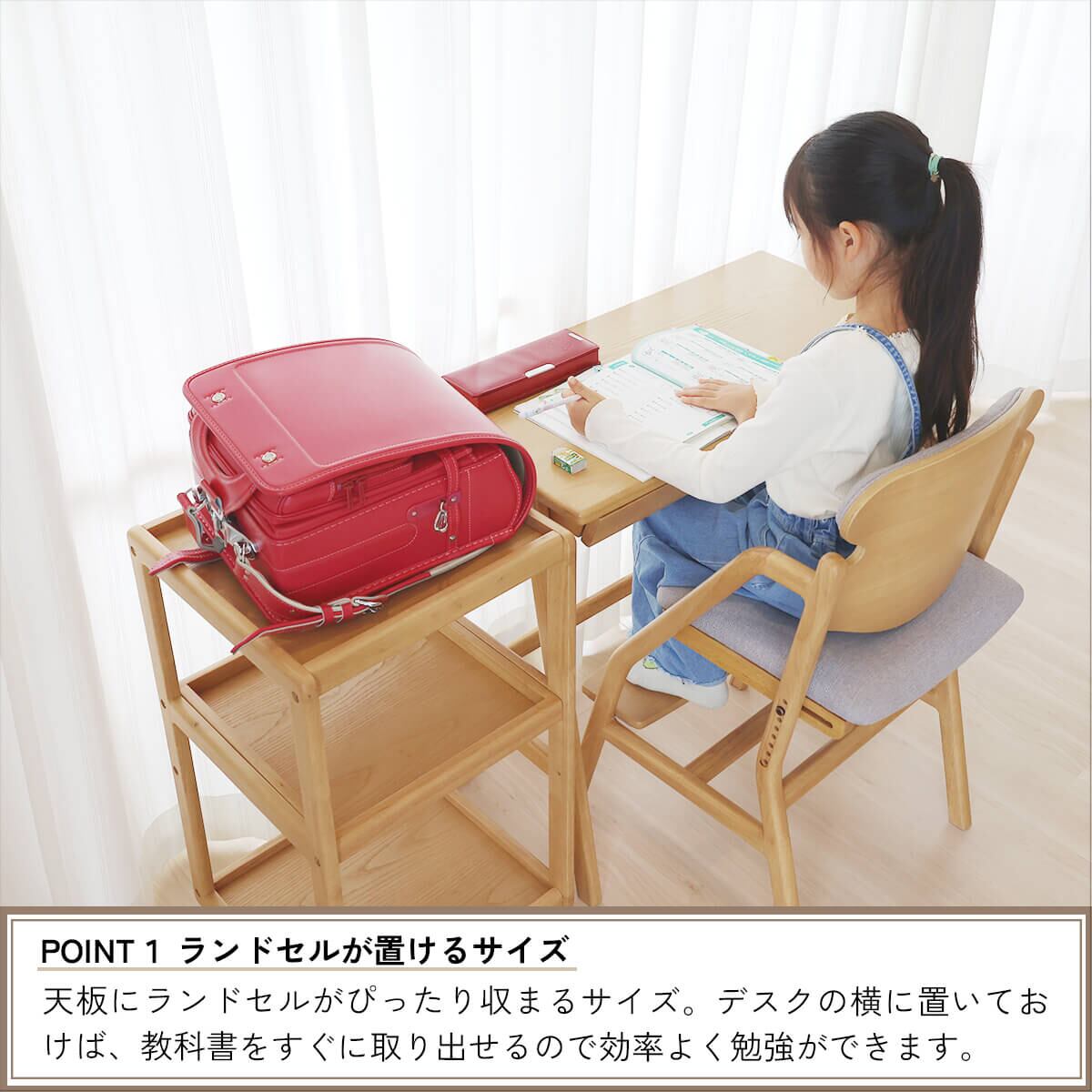 天板にはランドセルが収まるサイズなので、デスクの横に置いておくことで教科書などをすぐに取り出しやすい40cm幅のデスクサイドラックです。