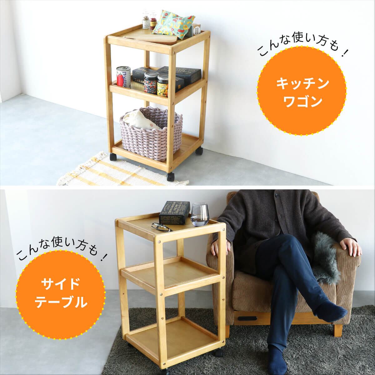 サイドラックとしての使用はもちろん、キッチンワゴンやサイドテーブルとしても使用可能なキャスター付きサイドラックです。
