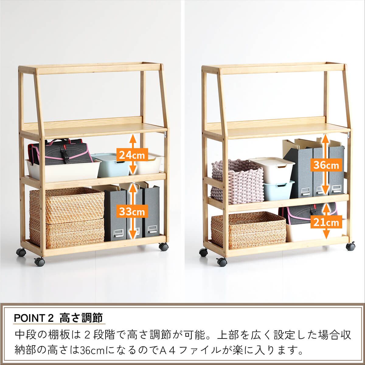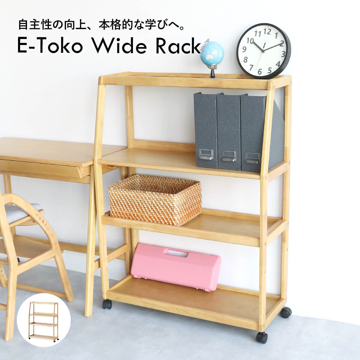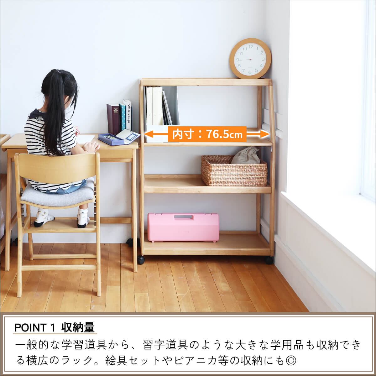 一般的な学習道具から、習字道具や絵の具セット、ピアニカのような大きな学習用品も収納できる80cm幅の幅広のキャスター付き収納ラックです。
